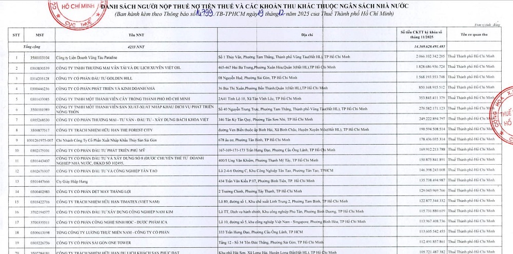 Cơ quan Thuế TP.HCM vừa công khai danh sách 4.233 doanh nghiệp nợ thuế và các khoản thu khác thuộc ngân sách nhà nước đến thời điểm tháng 11 năm 2025 gần 14.370 tỷ đồng.