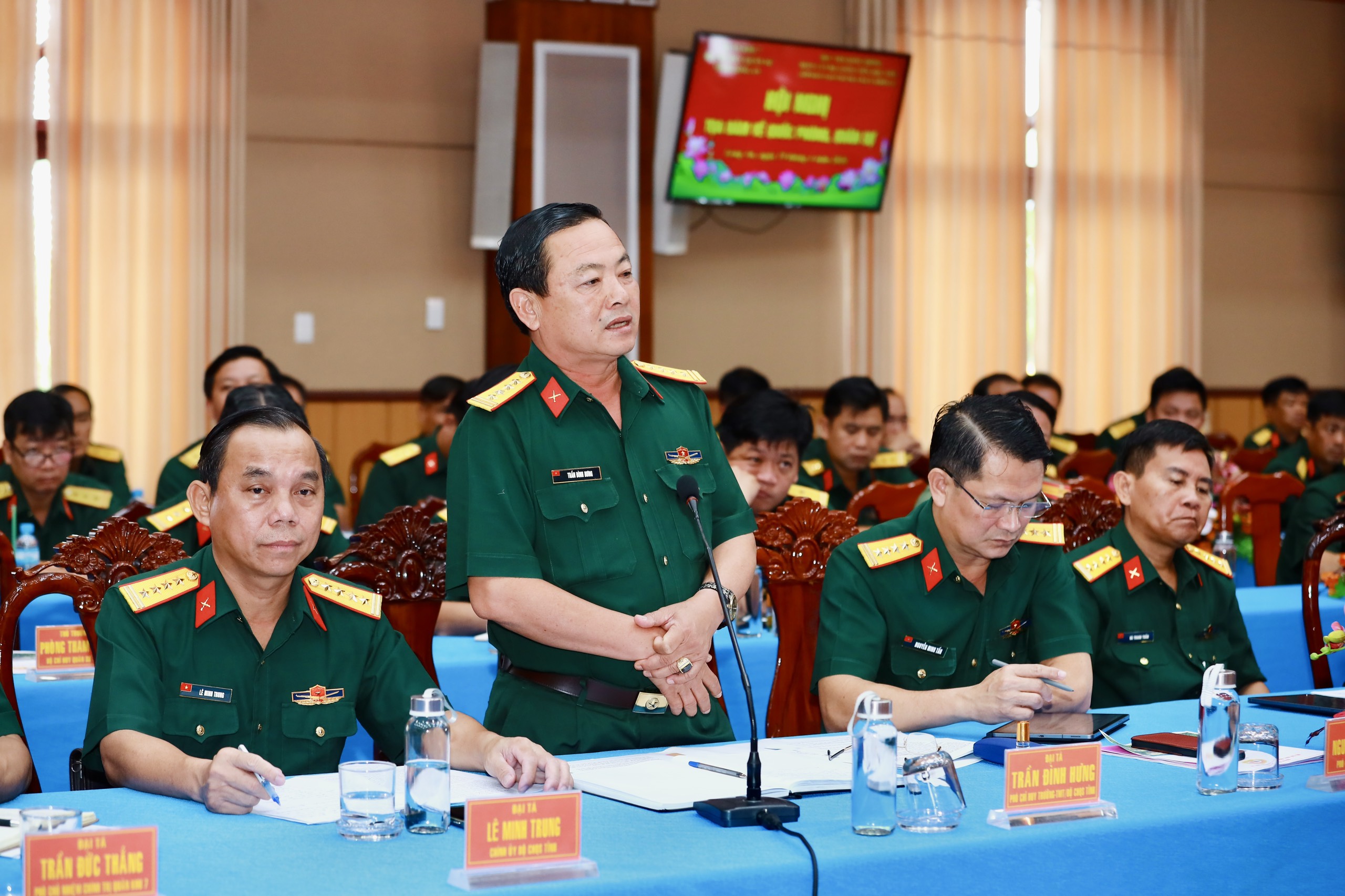 Đại tá Trần Đình Hưng, Phó Chỉ huy trưởng, Tham mưu trưởng Bộ CHQS tỉnh Long An phát biểu tại hội nghị.