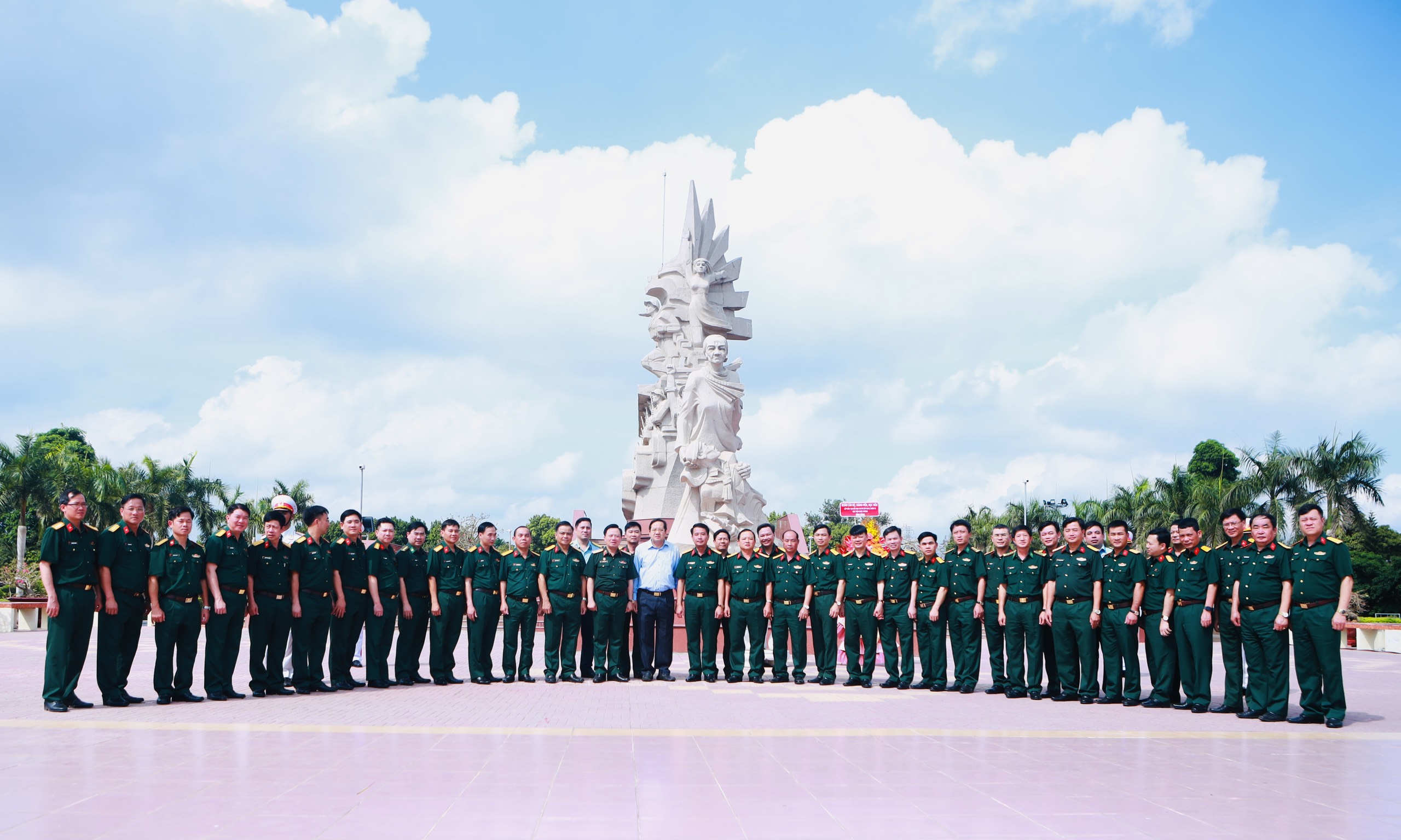 Các đại biểu đến tham quan, dân hương và chụp ảnh lưu niệm tại Tượng đài “Trung dũng kiên cường, toàn dân đánh giặc”.