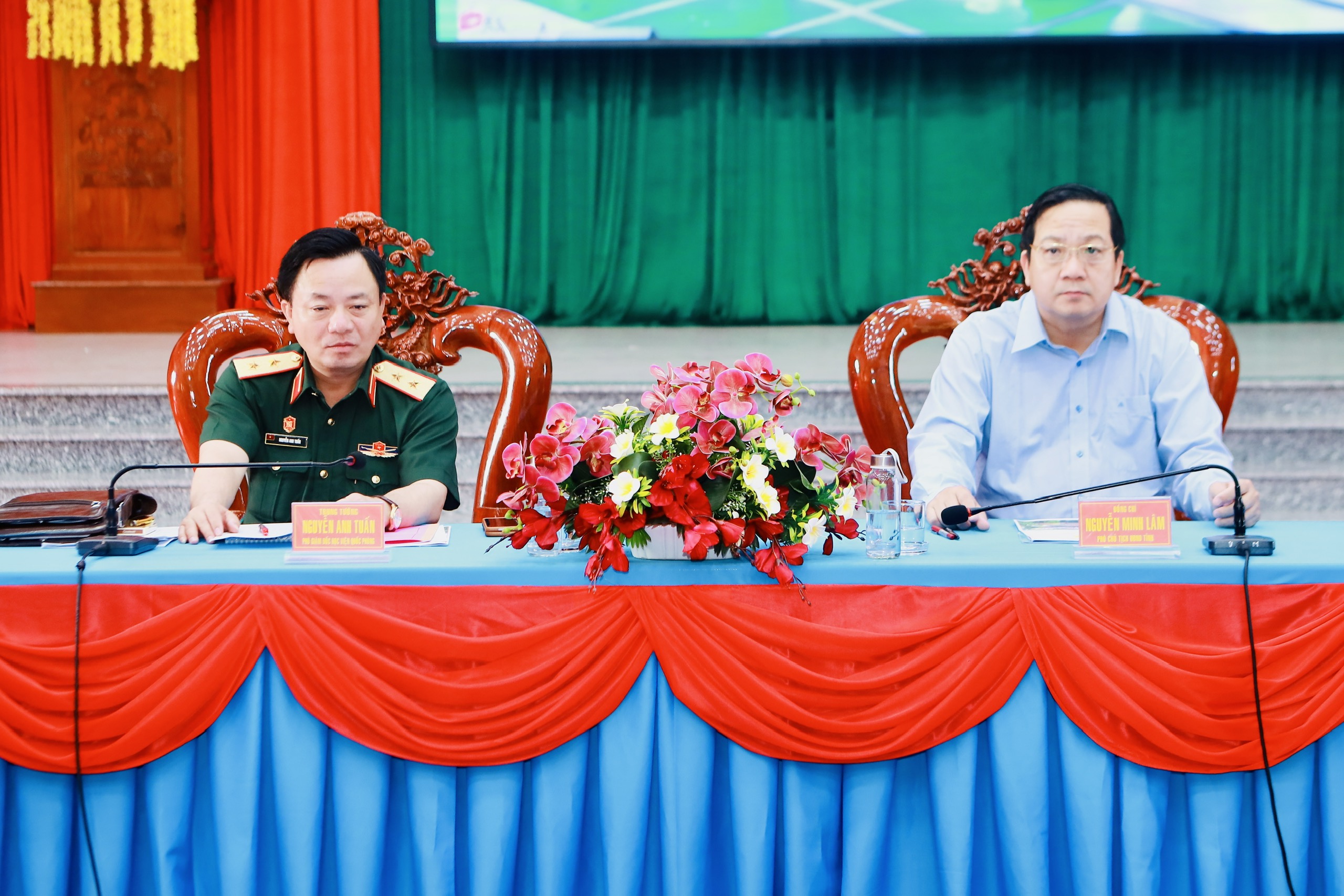 Trung tướng, Tiến sỹ Nguyễn Anh Tuấn, Phó Giám đốc Học viện Quốc phòng và đồng chí Nguyễn Minh Lâm, Phó Chủ tịch UBND tỉnh chủ trì hội nghị.