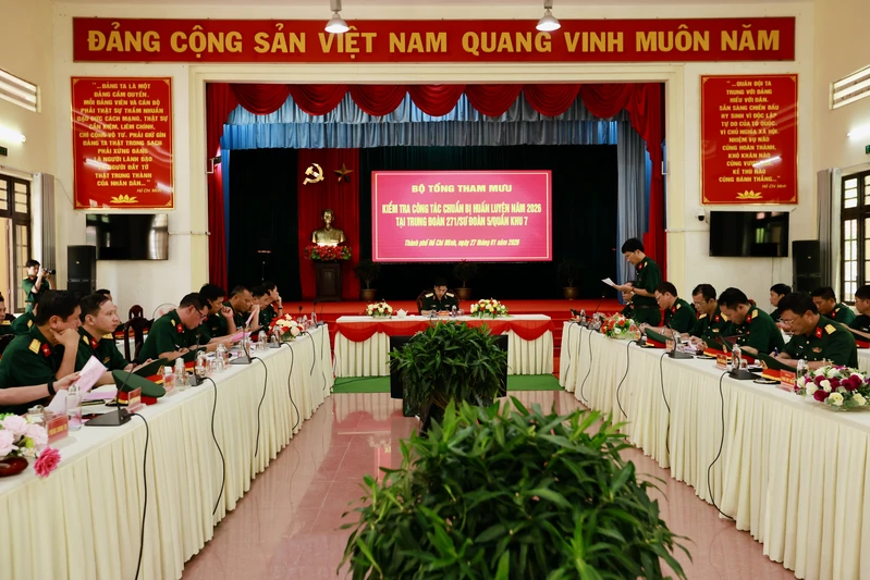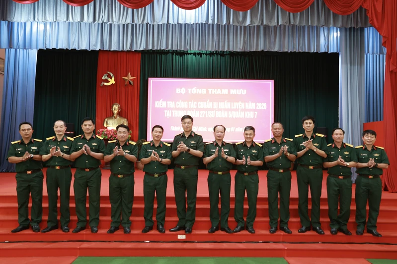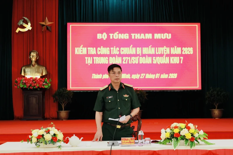 (QK7 Online) – Ngày 27/1, Đoàn công tác Bộ Tổng Tham mưu Quân đội Nhân dân Việt Nam do Thiếu tướng Tạ Quang Thảo, Phó Cục trưởng Cục Quân huấn – Nhà trường làm trưởng đoàn đã đến kiểm tra công tác chuẩn bị huấn luyện năm 2026 tại Trung đoàn 271, Sư đoàn 5. Tham gia cùng đoàn có Thiếu tướng Đinh Huy Chung, Phó Tham mưu trưởng Tổng Cục Hậu cần - Kỹ thuật; Đại tá Phùng Thế Hùng, Phó Tham mưu trưởng Quân khu 7; Đại tá Nguyễn Hồng Cảnh, Phó Chủ nhiệm Chính trị Quân khu và Đại tá Vũ Nam Sơn, Phó Chủ nhiệm Hậu cần - Kỹ thuật Quân khu.