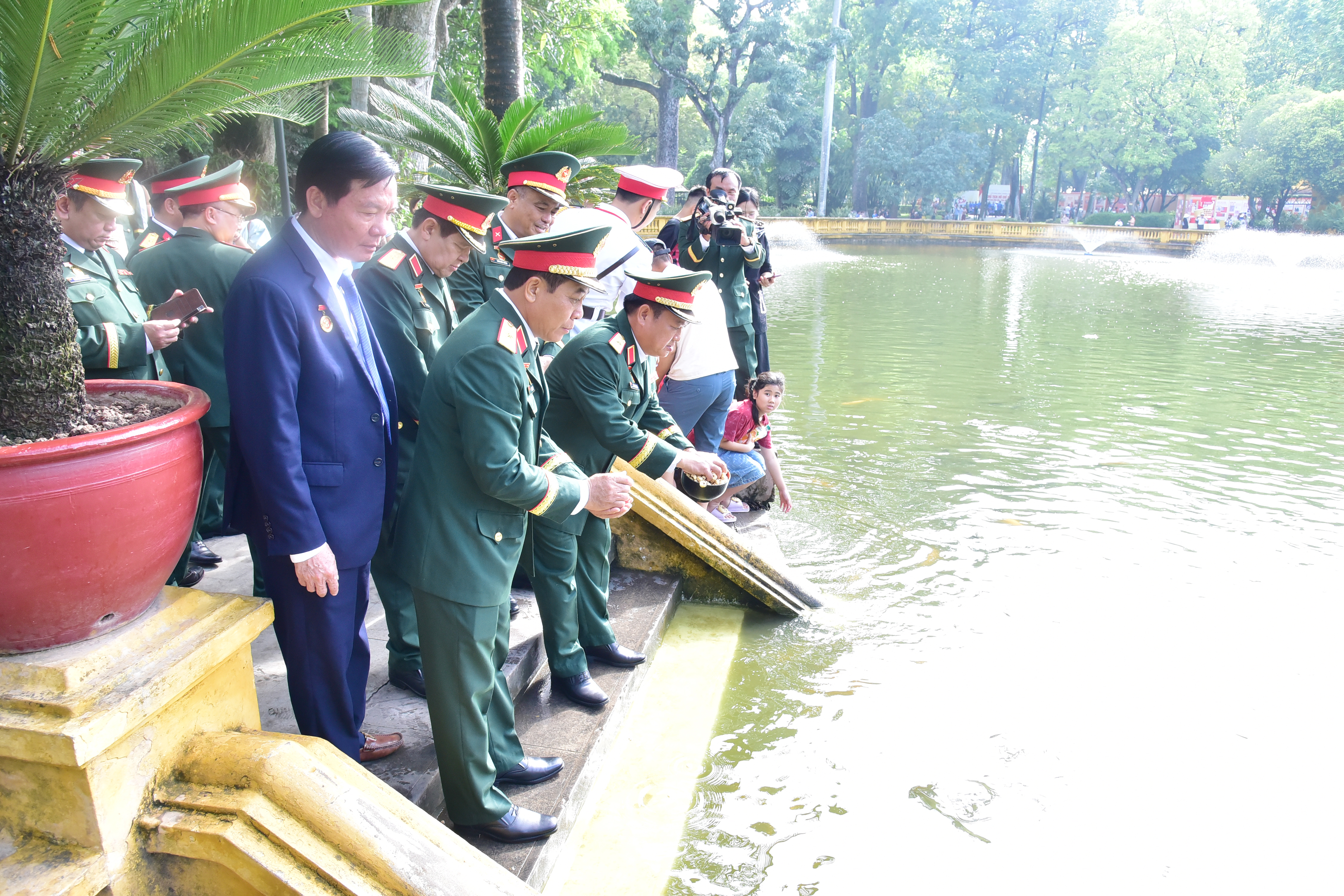 Thủ trưởng Bộ Tư lệnh Quân khu cho cá ăn tại ao cá Bác Hồ trong khu di tích Phủ Chủ tịch.