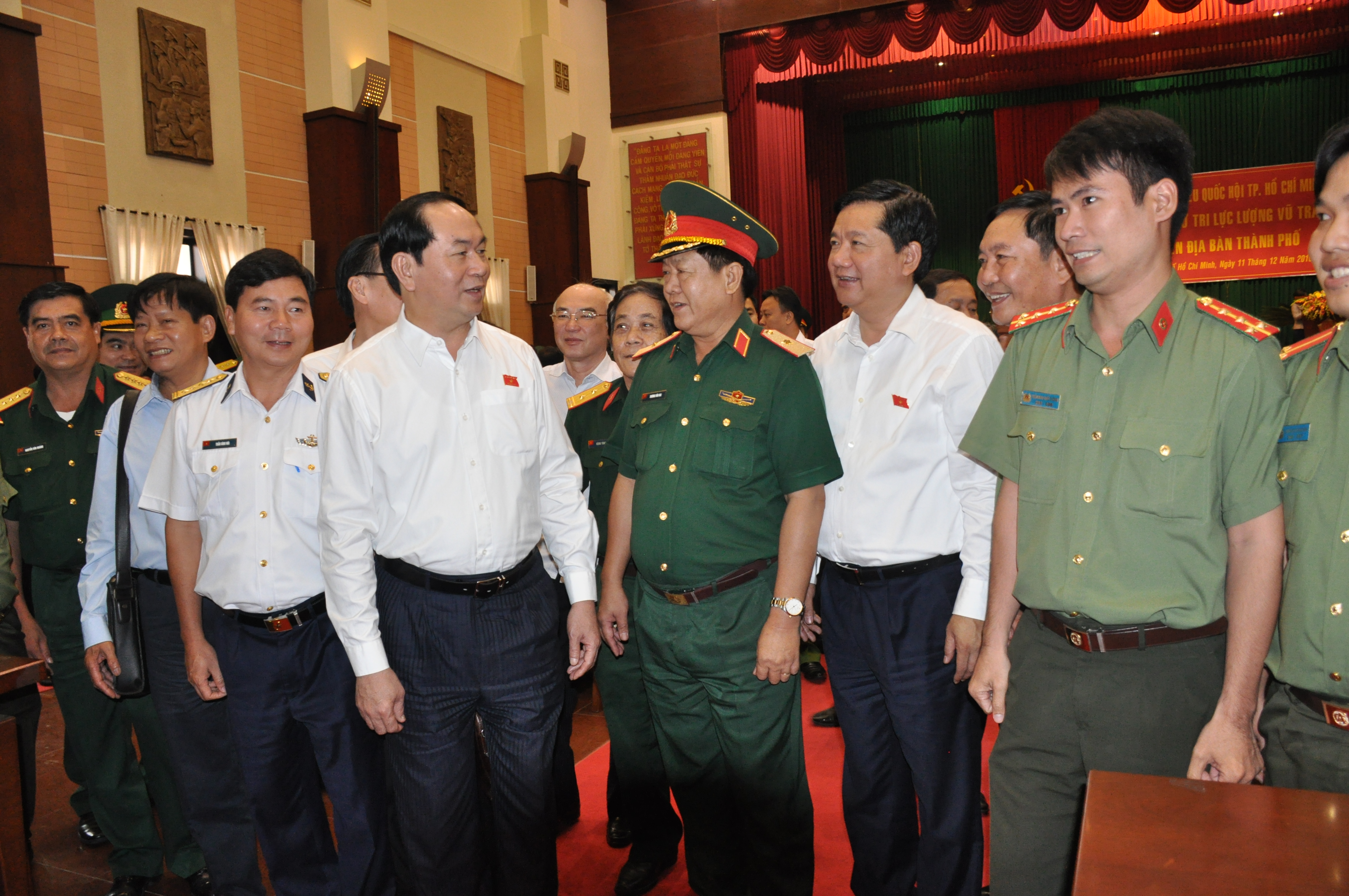 Vấn đề được nhiều cử tri quan tâm về nhiệm vụ của lực lượn vũ trang trong tình hình mới, xây dựng khu vực phòng thủ, Chủ tịch nước khẳng định đây là nhiệm vụ trọng yếu của toàn Đảng, toàn dân và toàn quân ta trong đó lực lượng vũ trang là nòng cốt. Lực lượng vũ trang phải luôn rèn luyện, huấn luyện và sẵn sàng chiến đấu cao. Tổ chức nắm tình hình và dự báo các tình huống có thể xảy ra để có biện pháp xử lý không để Tổ quốc bị bất ngờ. Các lực lượng vũ trang phát huy tinh thần trách nhiệm cao, nhận và hoàn thành mọi nhiệm vụ được giao, bảo vệ vững chắc Tổ quốc Việt Nam xã hội chủ nghĩa. Các lực lượng vũ trang cần phối hợp chặt chẽ với nhau, phát huy sức mạnh tổng hợp, thường xuyên luyện tập các phương án phòng thủ, xây dựng thế trận lòng dân vững chắc.