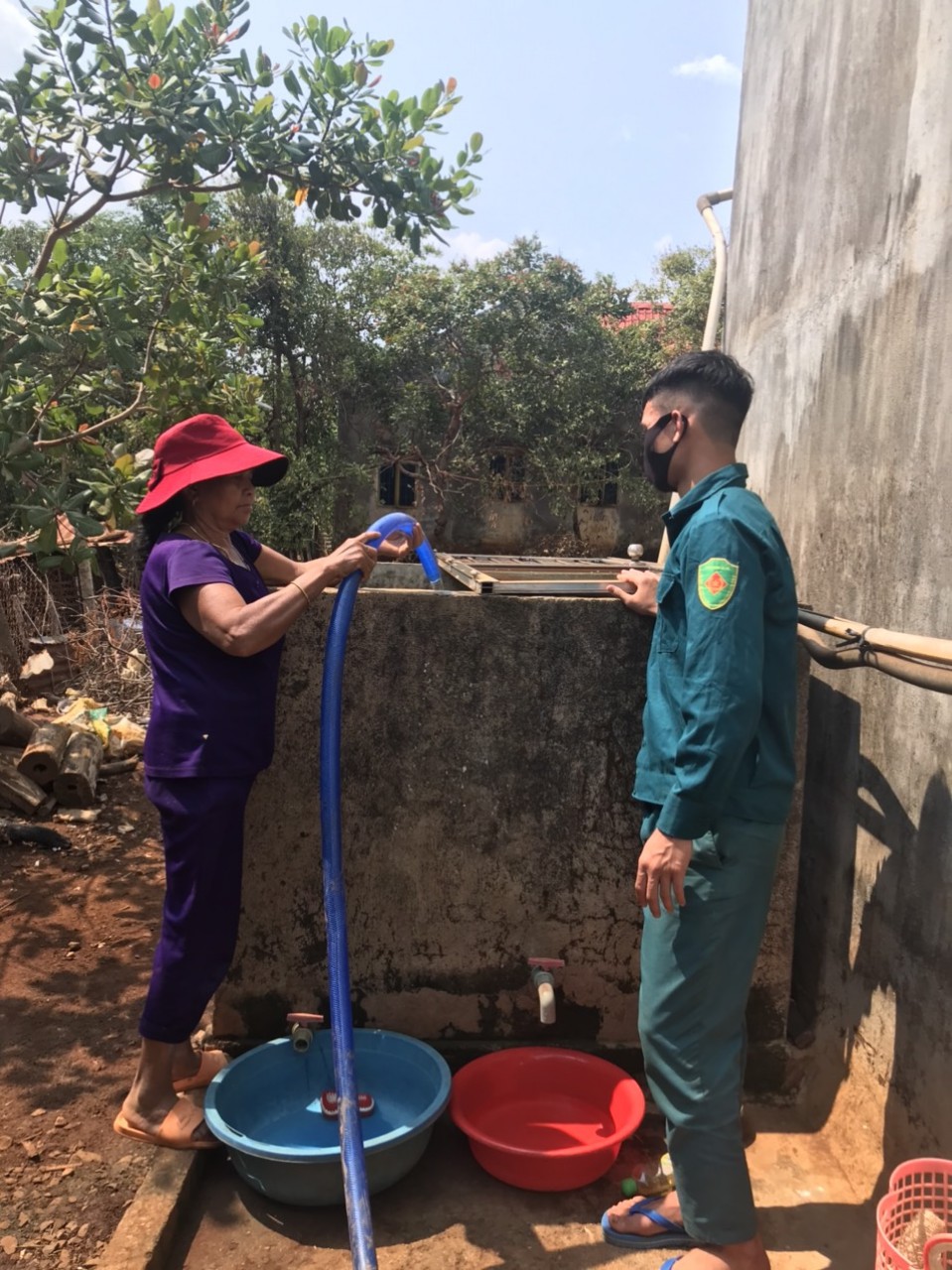 Là người trực tiếp bơm nước, lái xe cung cấp cho từng hộ, Thượng úy Nguyễn Thanh Định, Đoàn Kinh tế - Quốc phòng 778 cho biết: “Mỗi ngày, xe chở được 3 chuyến. Để bơm từ giếng khoan lên đầy 4 phuy, mỗi phuy 2m3 phải hết khoảng 90 phút. Sau khi bơm đầy, chúng tôi chạy tới chỗ thuận lợi nhất đậu xe để dân quân thường trực kéo ống bơm cho từng nhà. Vừa cấp nước, chúng tôi vừa phải vận động bà con ăn ở hợp vệ sinh, sử dụng nước tiết kiệm, đặc biệt đợt này có dịch Covid-19 nên phải kết hợp tuyên truyền bà con thực hiện tốt vệ sinh phòng dịch, đeo khẩu trang khi đi ra ngoài và giãn cách xã hội”.