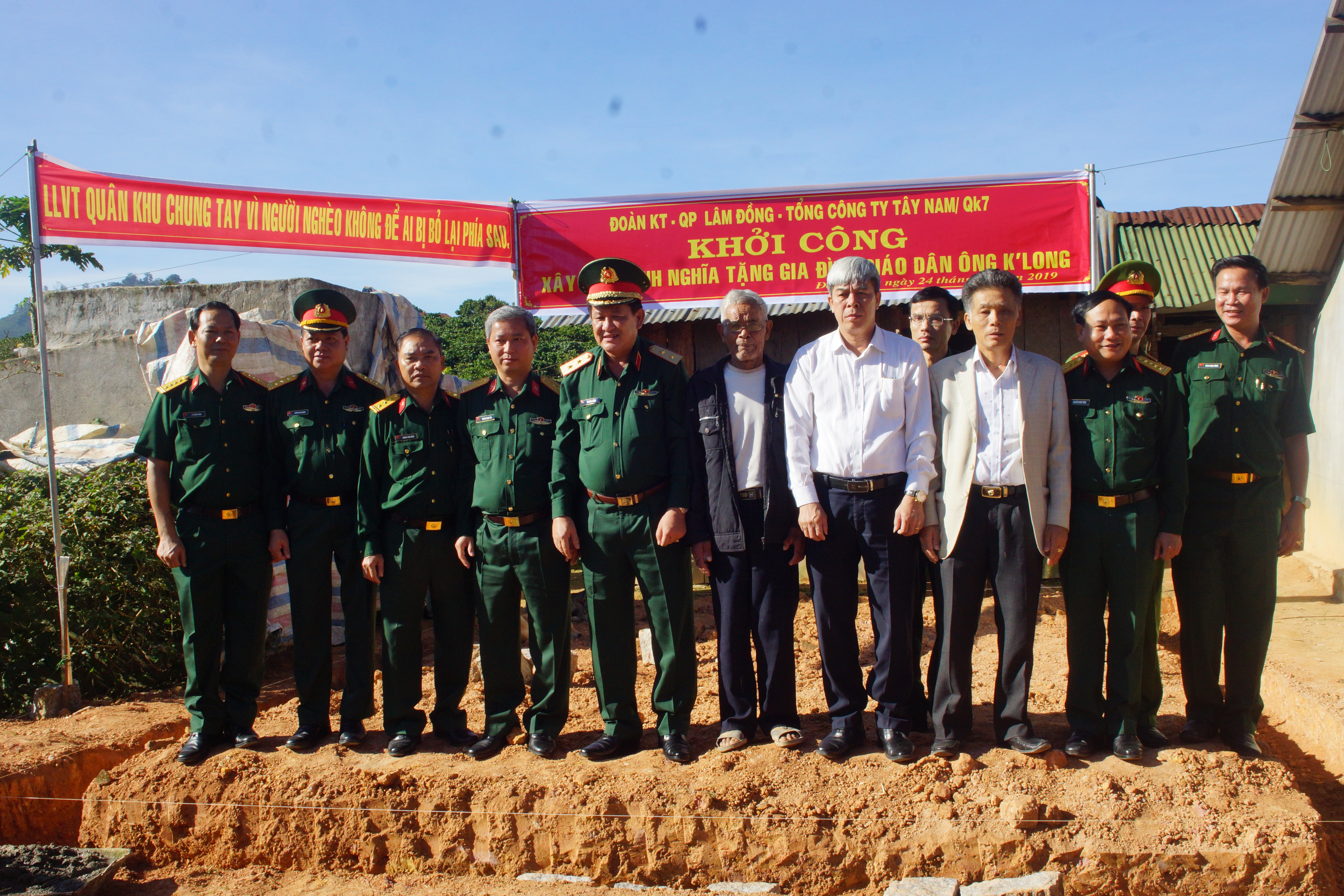 Trung tướng Võ Minh Lương, Ủy viên Trung ương Đảng, Tư lệnh Quân khu 7, chỉ huy Đoàn KT-QP và các đại biểu tại lễ khởi công xây tặng "Nhà tình nghĩa quân - dân" cho đồng bào dân tộc huyện Đam Rông, tỉnh Lâm Đồng