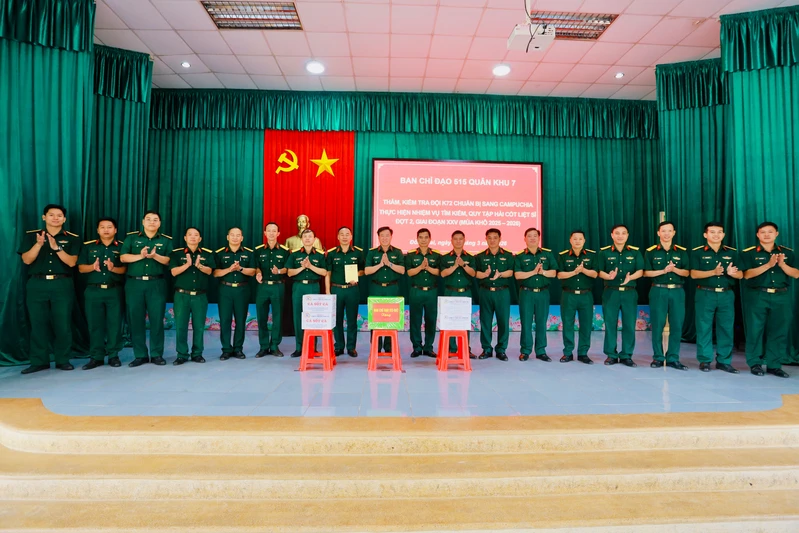 Dịp này, Đoàn công tác Ban Chỉ đạo 515 Quân khu 7 đã tặng quà, động viên cán bộ, chiến sĩ Đội K72, mong muốn đơn vị tiếp tục phát huy truyền thống, hoàn thành xuất sắc nhiệm vụ tìm kiếm, quy tập hài cốt liệt sĩ trong thời gian tới.