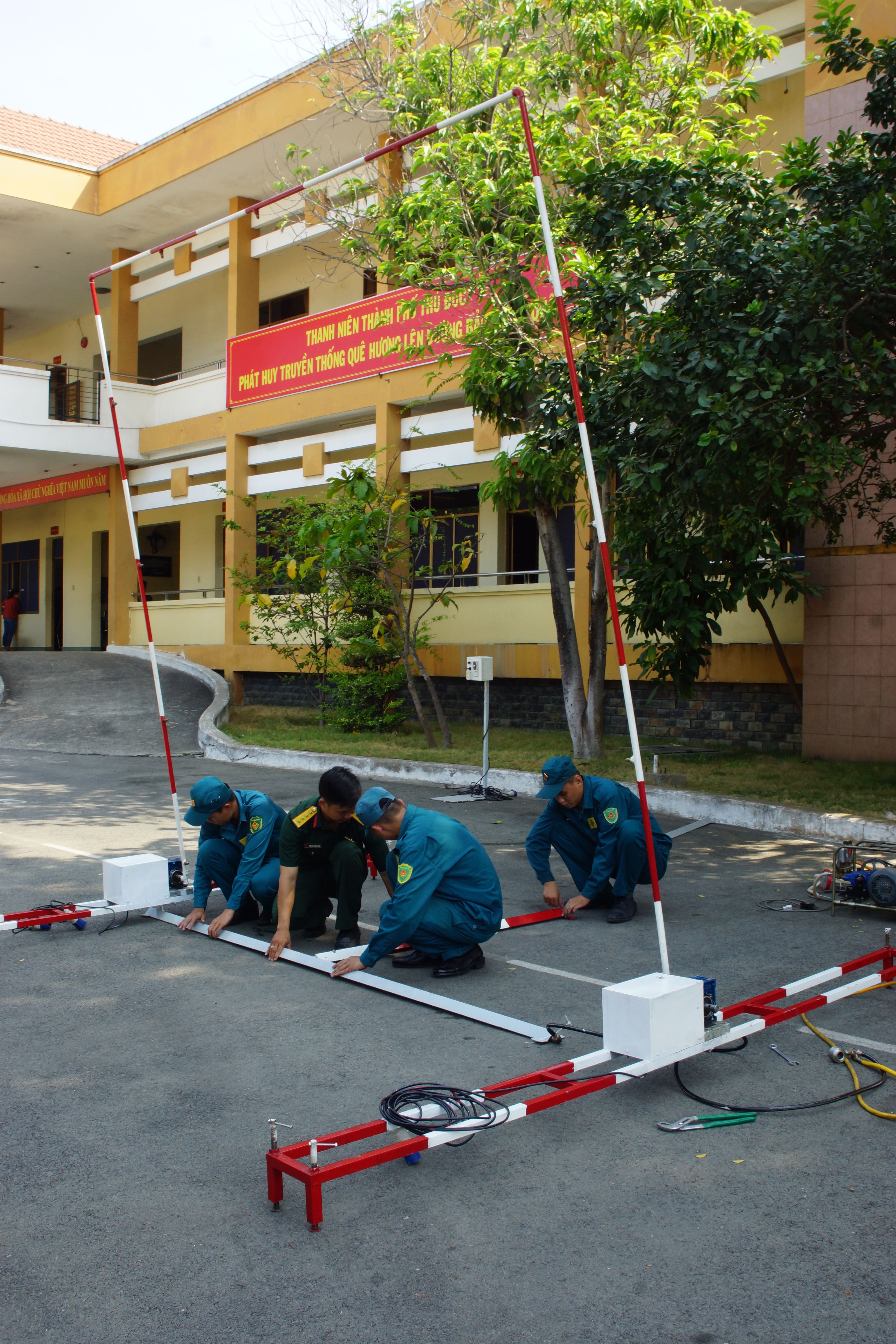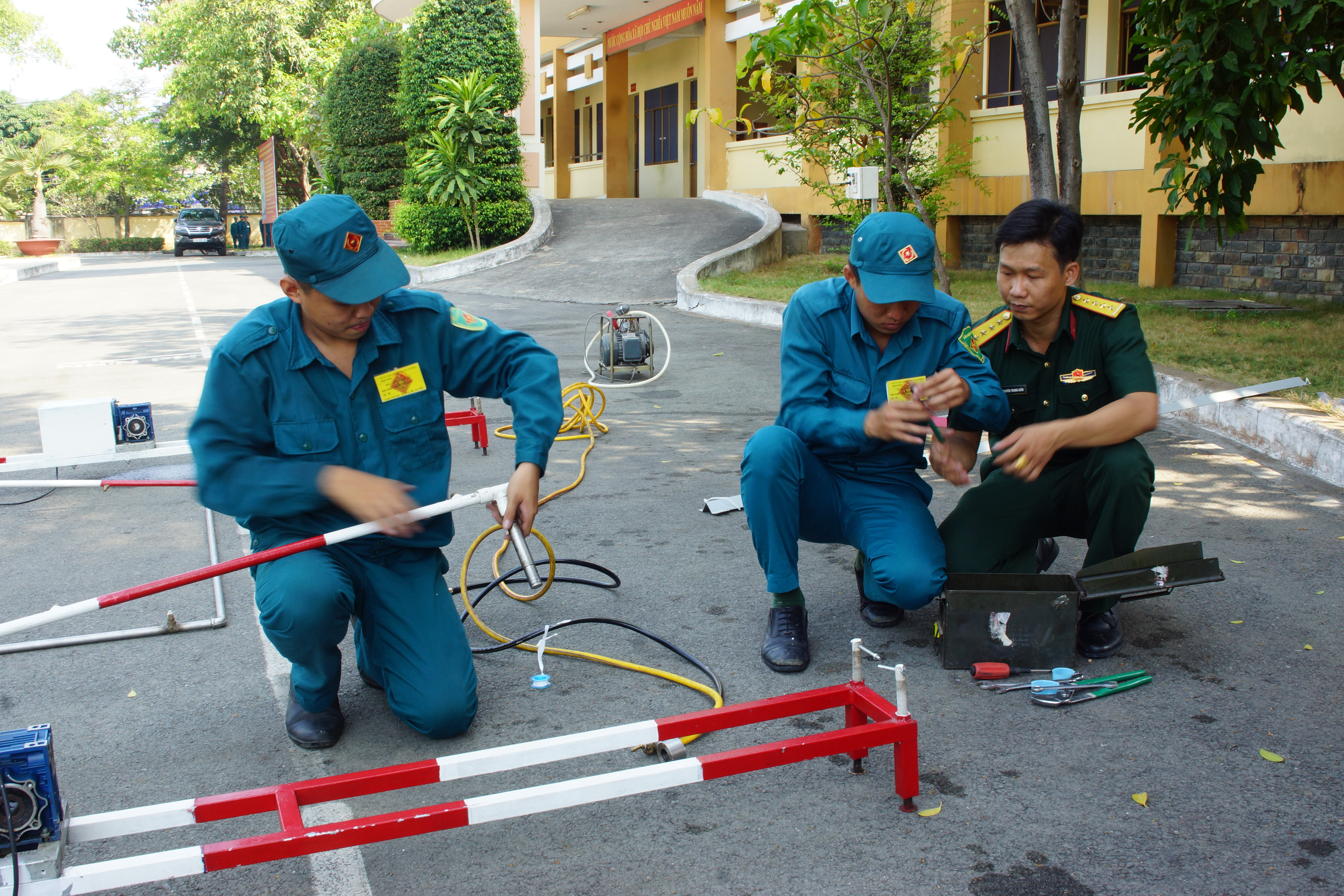 Đại úy Nguyễn Trung Kiên hướng dẫn cho chiến sĩ dân quân cách lắp đặt hệ thống “Đôi tay chiến sĩ robot diệt Covid – 19”.