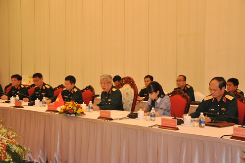 Thượng tướng Nguyễn Chí Vịnh, Ủy viên Trung ương Đảng, Thứ trưởng Bộ Quốc phòng Việt Nam  (hàng đầu, thứ 3 từ bên phải) phát biểu tại buổi đối thoại