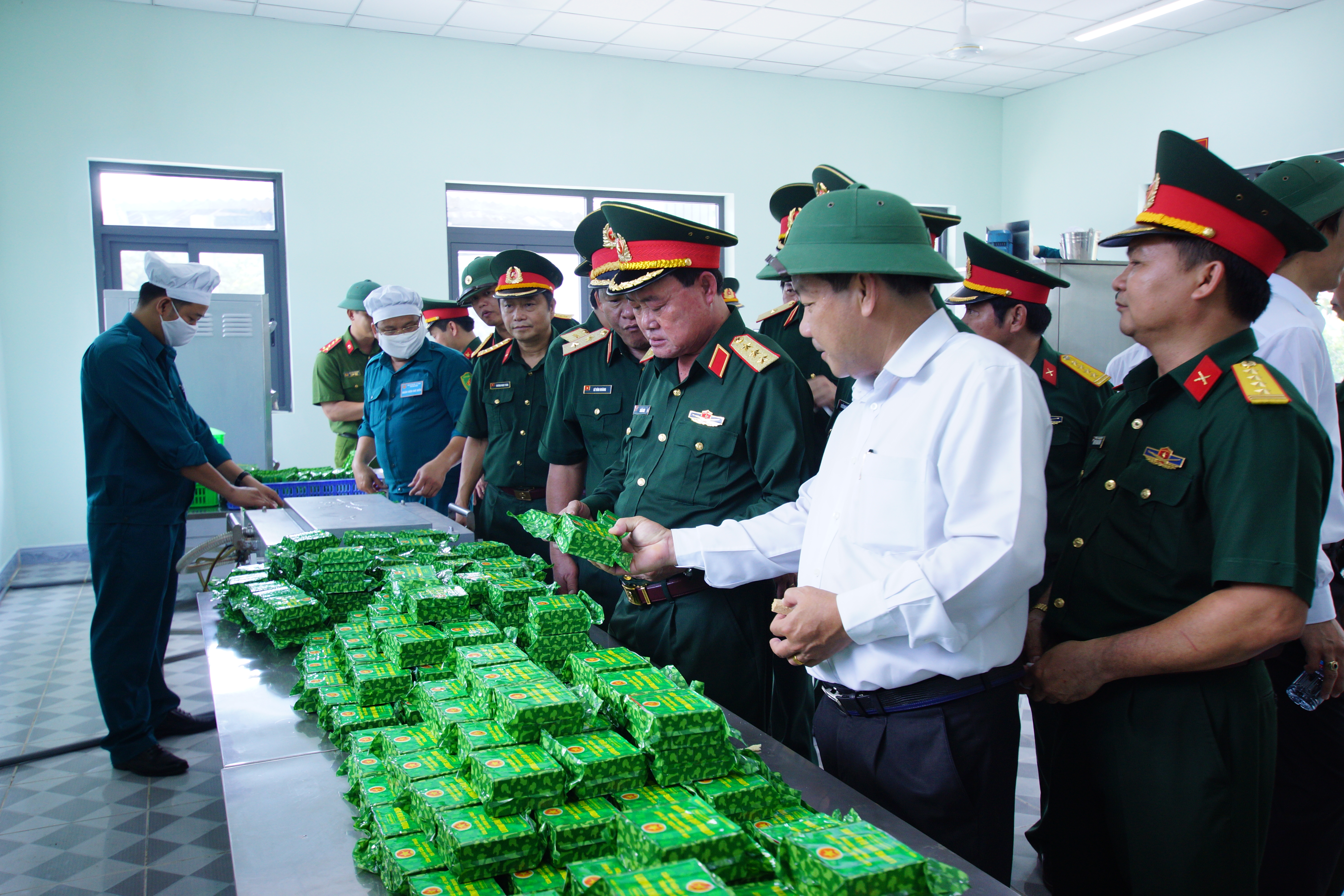 Lãnh đạo Bộ Quốc phòng tham quan trạm chế biến lương thực, thực phẩm tại căn cứ hậu cần – kỹ thuật Bộ CHQS tỉnh Bình Dương. Ảnh: Tuấn Anh