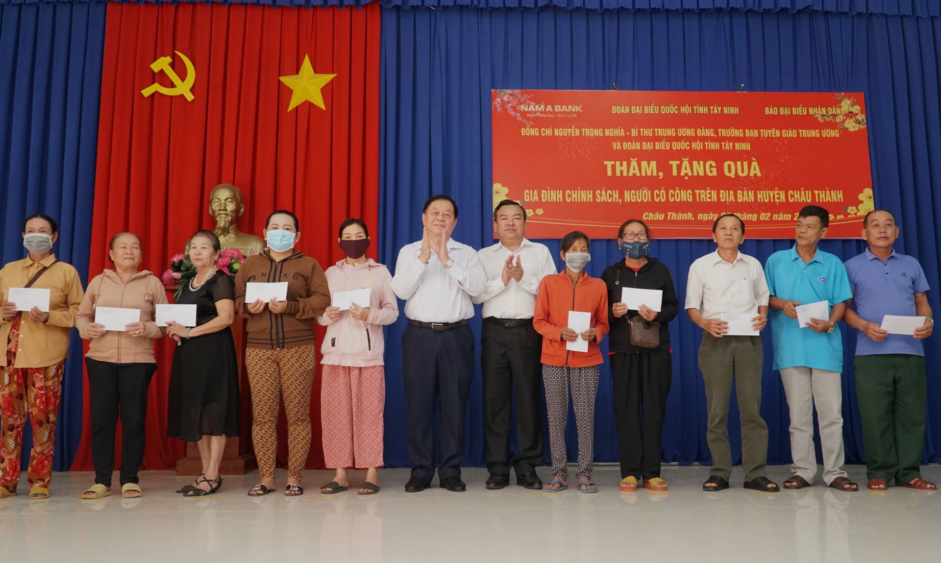 Cùng ngày, đồng chí Nguyễn Trọng Nghĩa và đoàn công tác đến Trung tâm văn hóa - Thể thao và Học tập cộng đồng xã Thái Bình (huyện Châu Thành) trao tặng 100 phần quà cho 100 hộ gia đình chính sách, người có công trên địa bàn huyện Châu Thành, mỗi phần quà trị giá 1 triệu đồng.