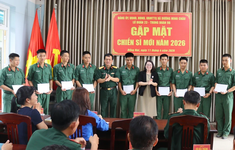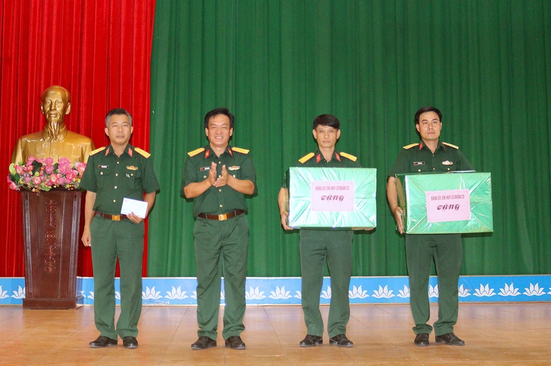 Đồng chí Châu Ngọc Bích, Phó Chủ tịch UBND xã Dương Minh Châu và Đại tá Đinh Nam Đàn, Chính ủy Lữ đoàn 23 tặng quà các chiến sĩ mới.