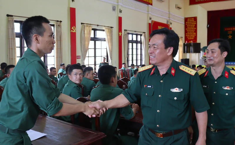 Đại tá Đinh Nam Đàn thăm hỏi, động viên chiến sĩ mới đang huấn luyện tại Tiểu đoàn 4, Trung đoàn 96.