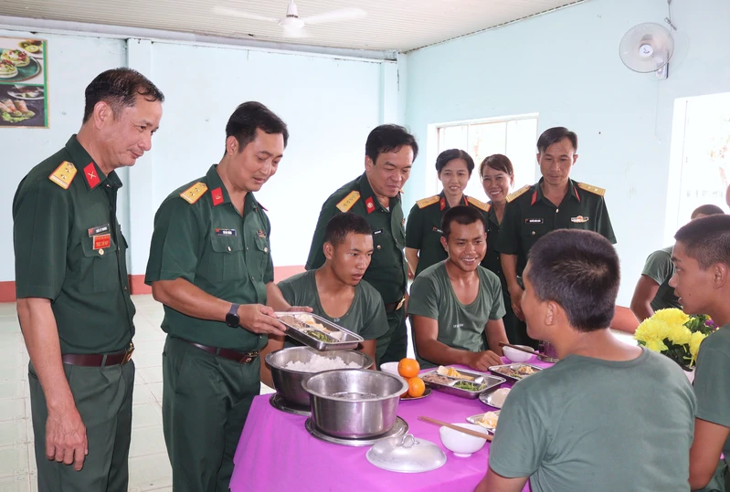 Đoàn công tác kiểm tra chất lượng bữa ăn của chiến sĩ mới.