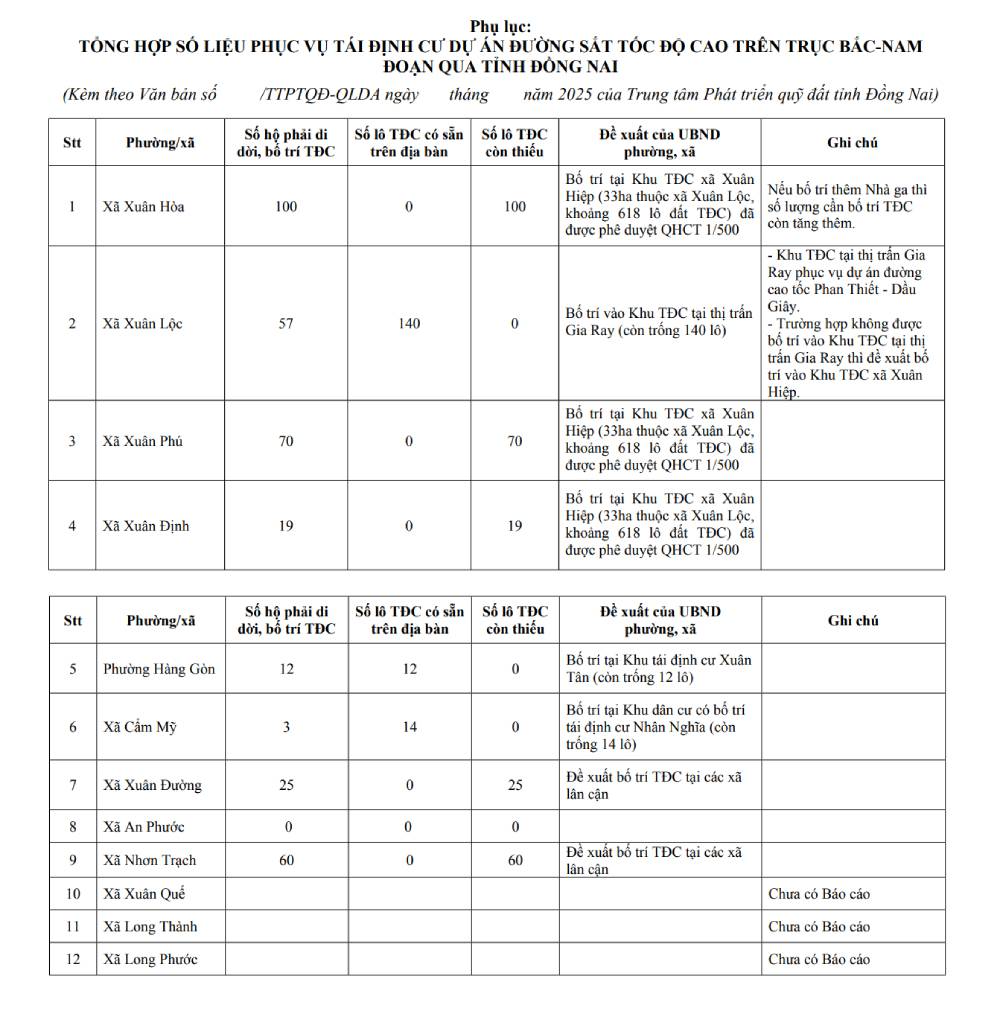 Tỉnh Đồng Nai đề nghị UBND các phường, xã: Xuân Quế, Long Thành, Long Phước, Nhơn Trạch, Xuân Đường, Xuân Định, Xuân Phú, Xuân Hòa rà soát các khu đất tái định cư trên địa bàn, chuẩn bị các vị trí để bố trí tái định cư cho các hộ dân bị thu hồi đất thuộc dự án đường sắt tốc độ cao trên trục Bắc - Nam đoạn qua tỉnh Đồng Nai theo đúng quy định.