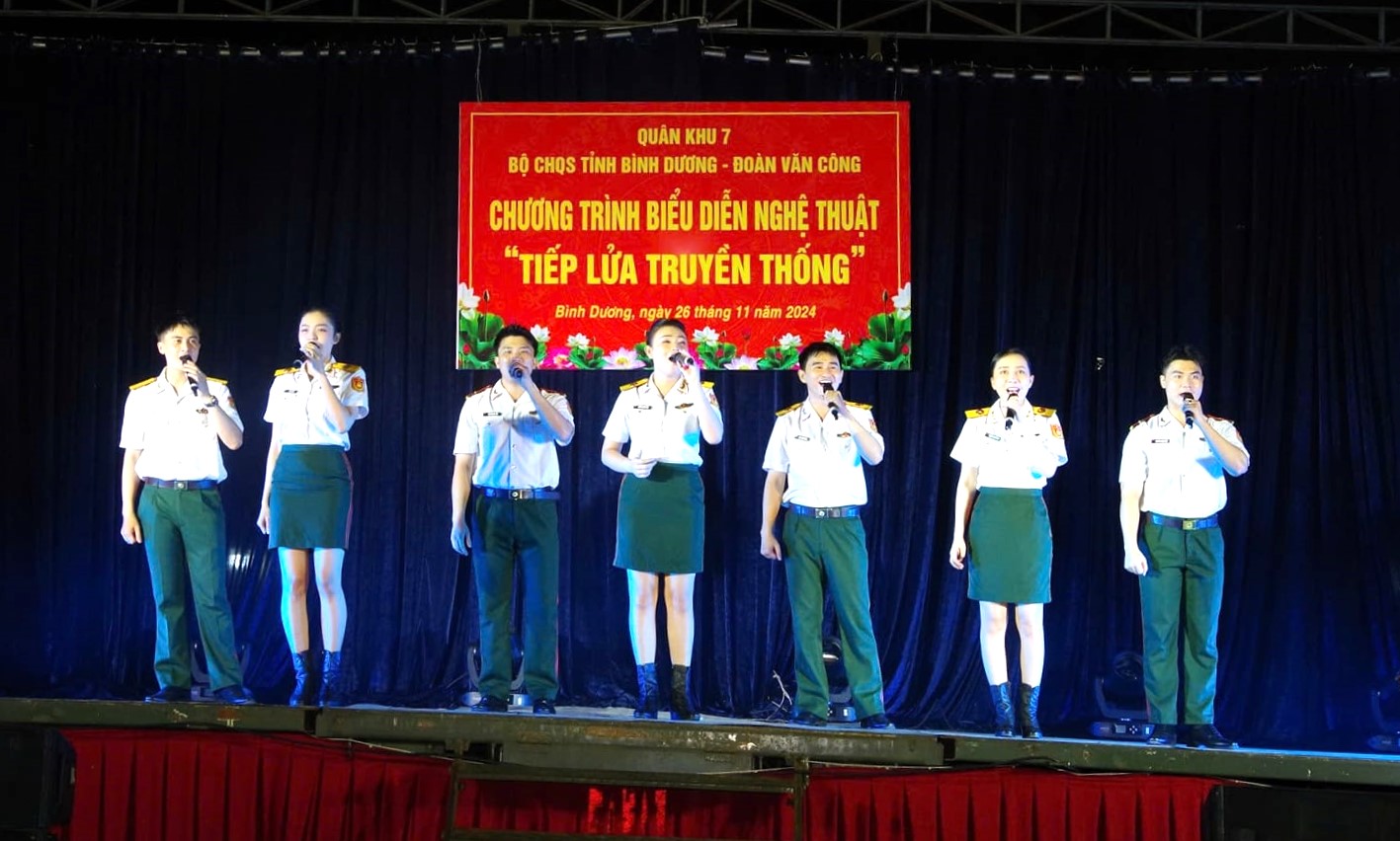 (QK7 Online) - Tối 26/11, tại huyện Phú Giáo, tỉnh Bình Dương, Đoàn Văn công Quân khu biểu diễn nghệ thuật phục vụ cán bộ, chiến sĩ tham gia diễn tập tác chiến phòng thủ Quân khu năm 2024.