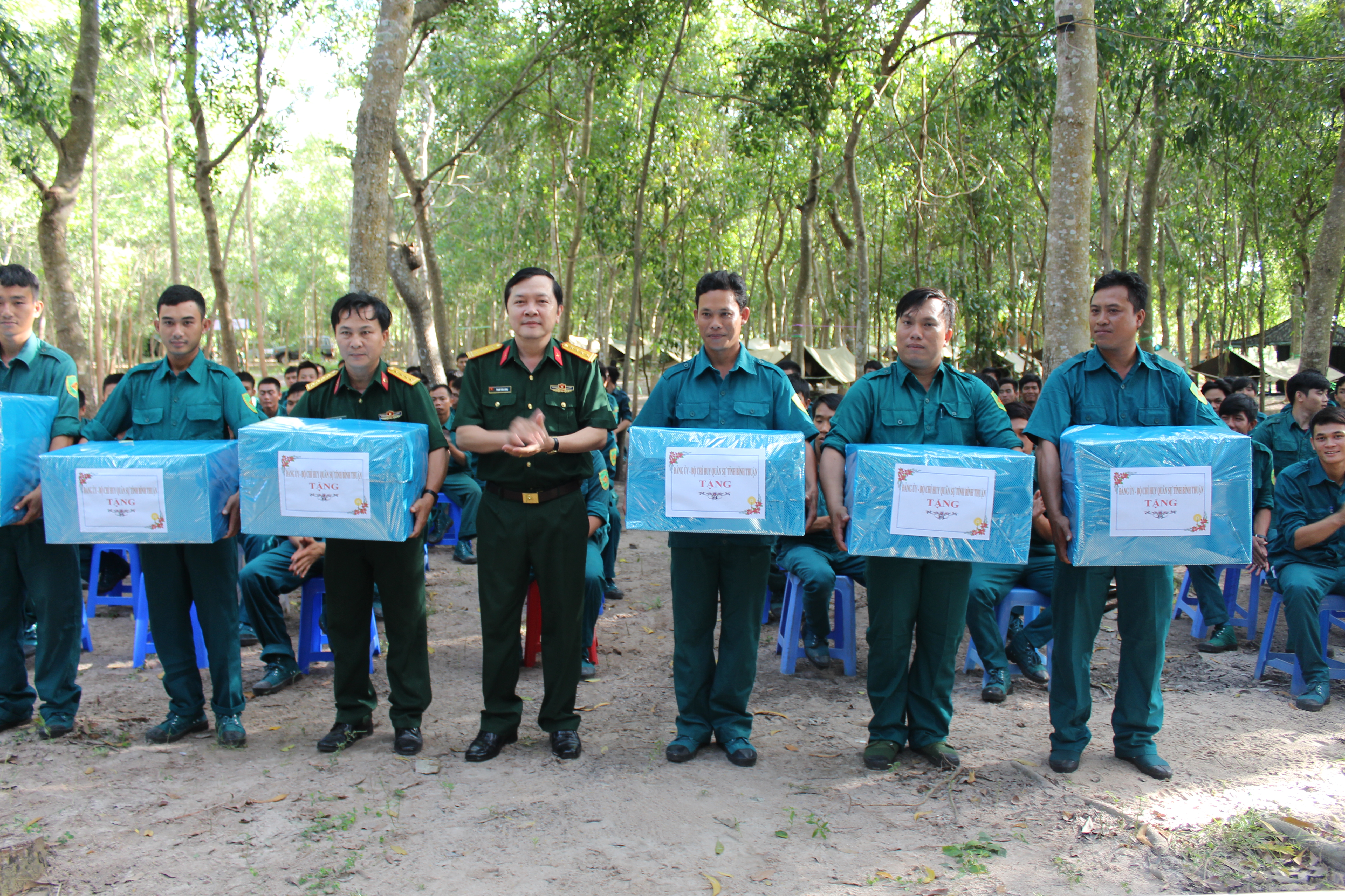 Đại tá Phạm Văn Long, Chính ủy Bộ CHQS tỉnh Bình Thuận đến thăm, động viên và tặng quà cho DQTV tham gia diễn tập
