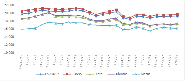 Biến động giá bán xăng dầu trong nước năm 2025 (26/12/2024 đến 05/6/2025)