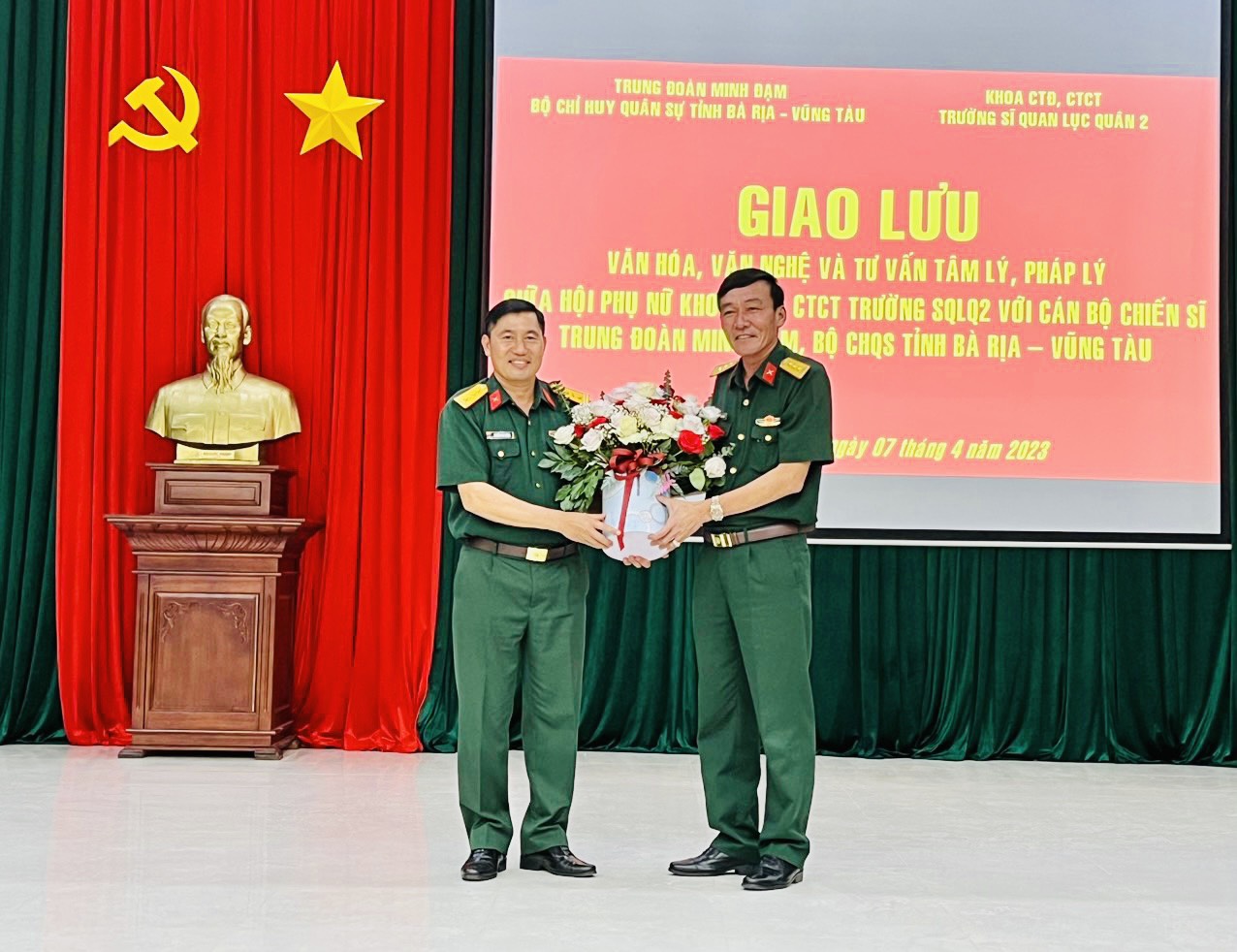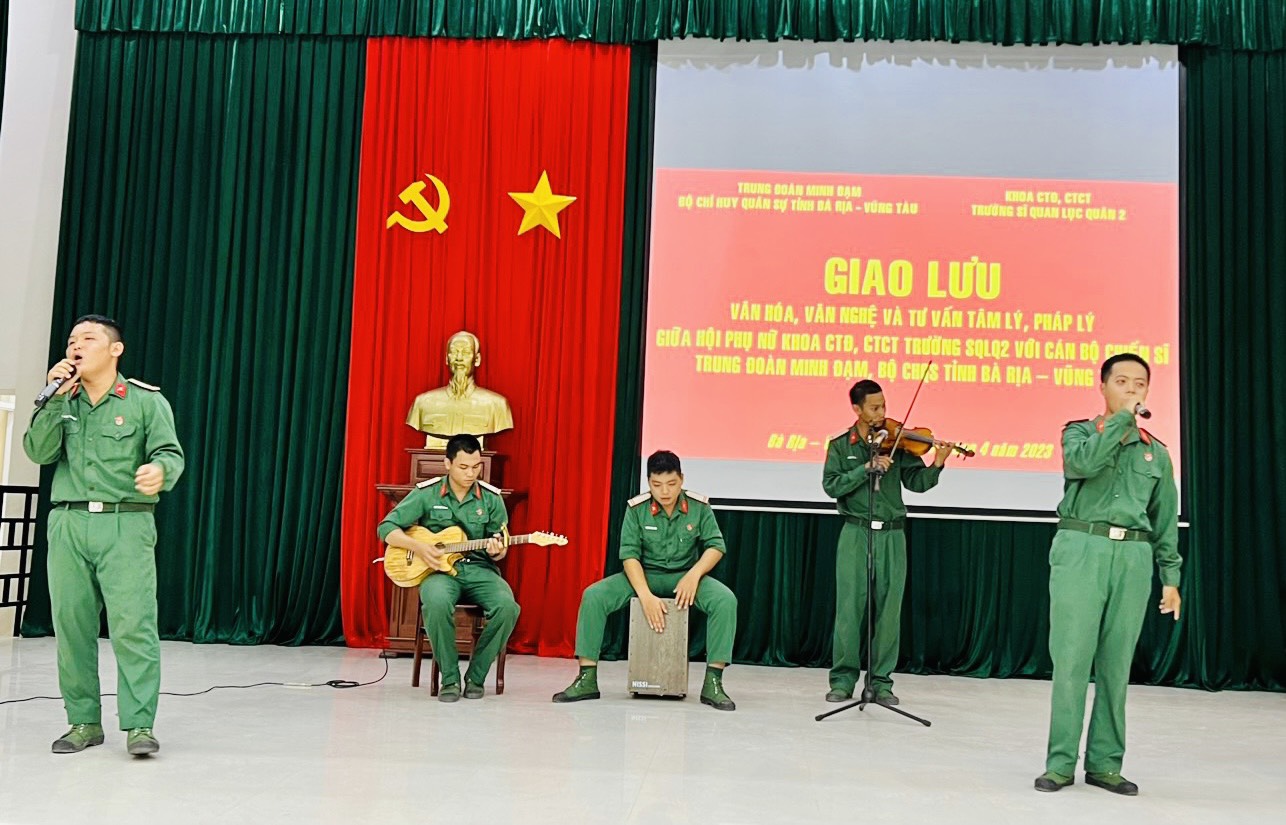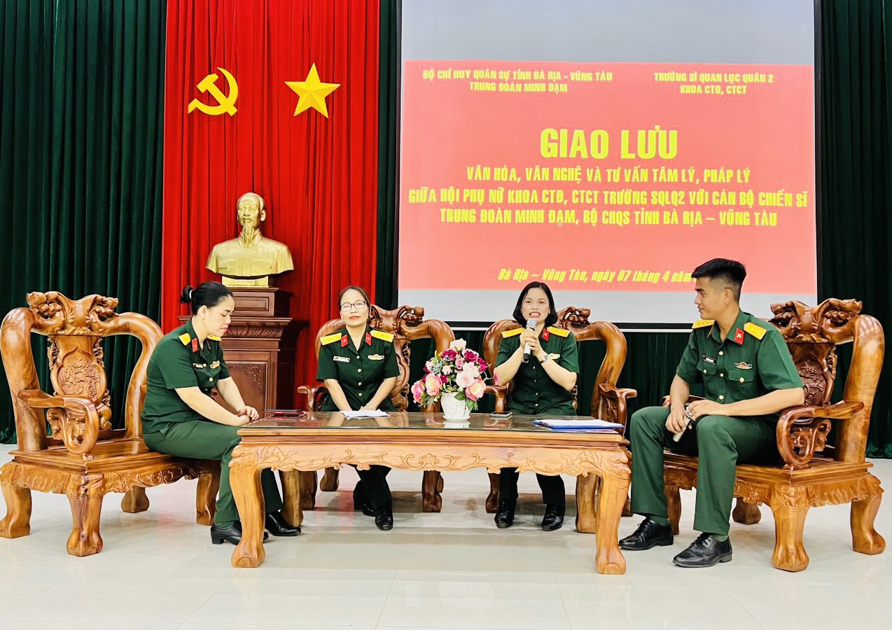 (QK7 Online) - Tối 7-4, Trung đoàn Minh Đạm, Bộ CHQS tỉnh Bà Rịa-Vũng Tàu phối hợp với Hội Phụ nữ Khoa Công tác Đảng, công tác chính trị (CTĐ, CTCT) Trường Sĩ quan Lục quân 2 tổ chức chương trình giao lưu văn hóa - văn nghệ và tư vấn tâm lý, pháp lý cho cán bộ, chiến sĩ.