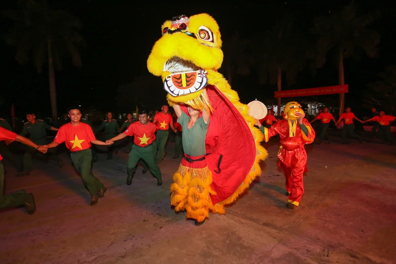 Bộ đội cùng múa dân vũ và múa lân chào đón năm mới.