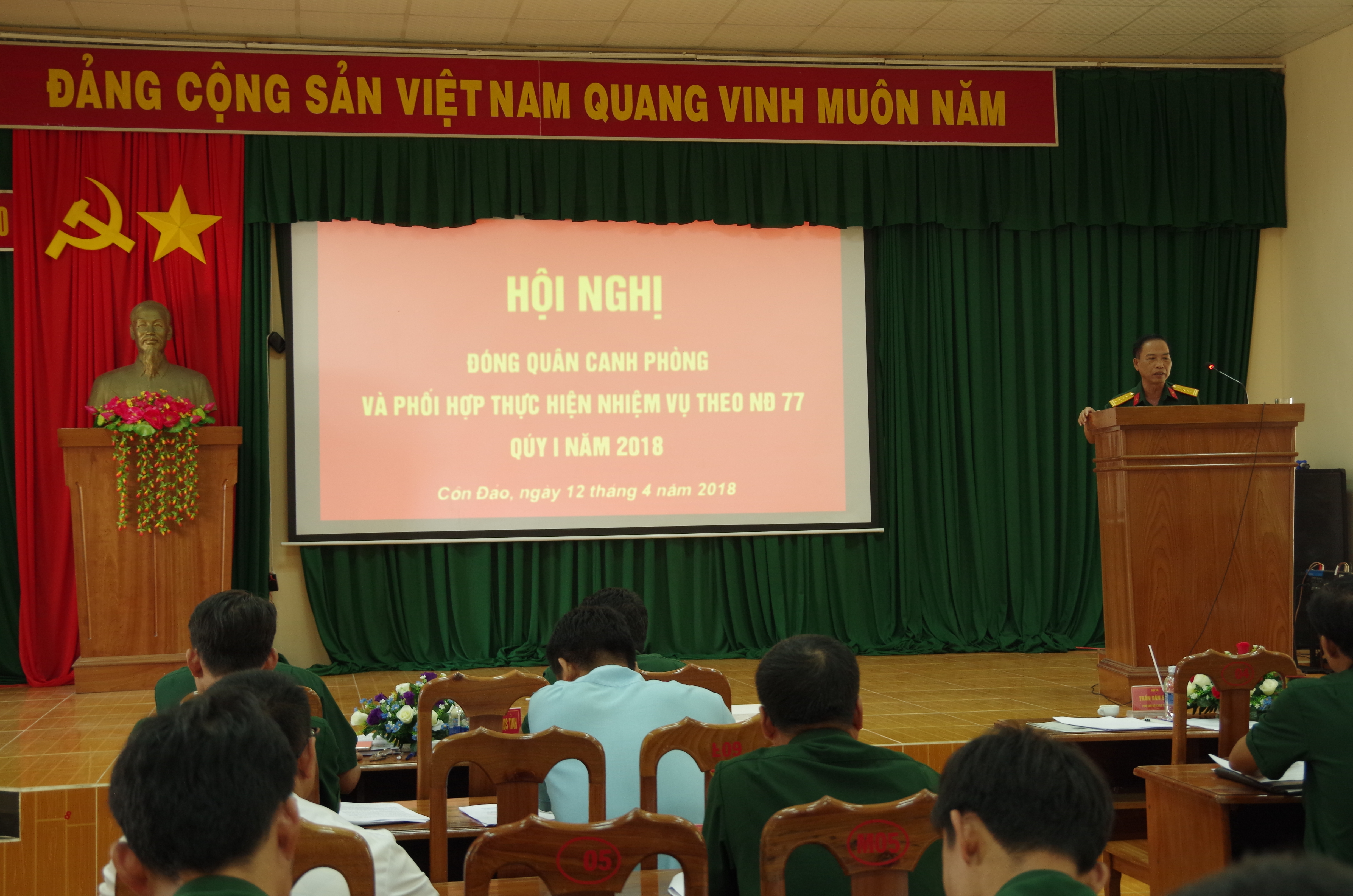 Đại tá Trần Văn Sơn, Phó Chỉ huy trưởng Bộ CHQS tỉnh phát biểu tại hội nghị