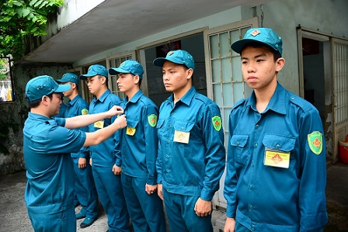 Ban CHQS phường 19, quận Bình Thạnh kiểm tra tác phong chiến sĩ dân quân trước khi thực hiện nhiệm vụ.