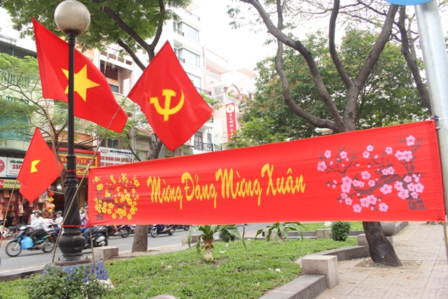Cờ Tổ quốc, cờ Đảng, các khẩu hiệu mừng năm mới được bán trên phố Hải Thượng Lãn Ông