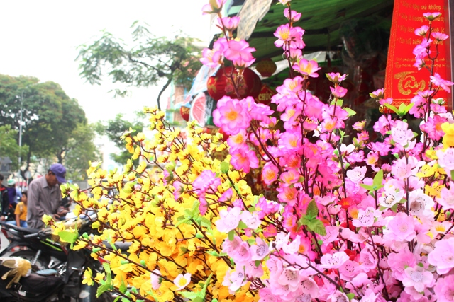 Các loại hoa đòa, hoa mai nhựa đươc người dân ưa chuộng mua về chưng Tết