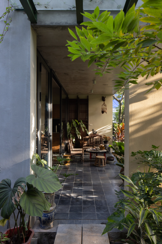 Điểm nhấn đầu tiên là hàng hiên – một khoảng đệm nhịp nhàng giữa trong và ngoài. Trong kiến trúc nhiệt đới, hàng hiên không chỉ để che nắng, chắn mưa mà còn là linh hồn kết nối con người với thiên nhiên, nơi ông bà có thể ngồi nhâm nhi chén trà và cảm nhận luồng gió Đông Nam thổi vào từ cánh đồng.