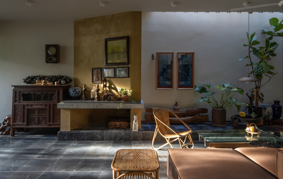 Một chi tiết đắt giá và đầy hoài niệm tại trung tâm tầng trệt chính là lò sưởi đốt củi. Không đơn thuần là vật trang trí, lò sưởi đóng vai trò điều tiết độ ẩm trong những mùa nồm ẩm đặc trưng của miền Bắc, đồng thời trở thành trục thông gió tự nhiên vào mùa hè. Đây là điểm hội tụ của các thành viên trong gia đình vào những đêm đông lạnh giá, tái hiện hình ảnh bếp lửa hồng trong ký ức xưa.