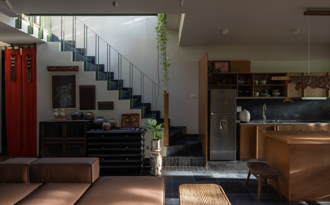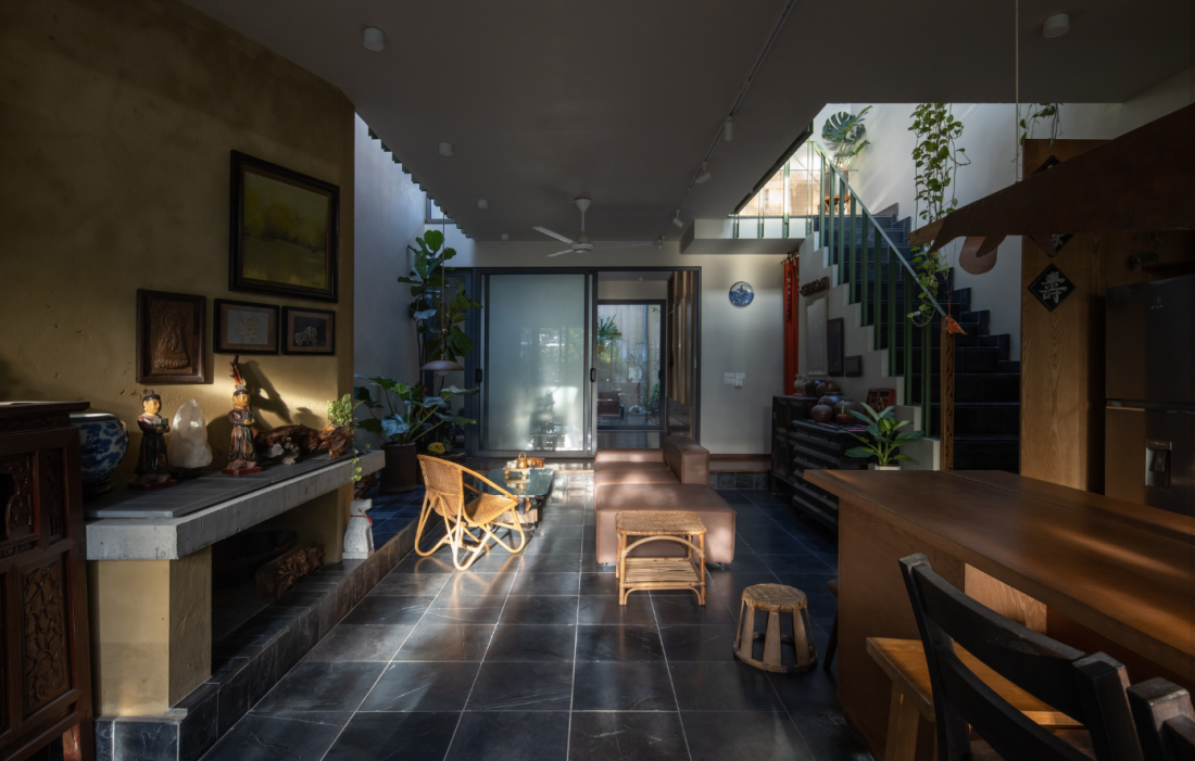 Bước qua hàng hiên là không gian bếp và phòng ăn – trái tim của sự sum vầy. Khác với những căn hộ chung cư chật hẹp trước đây, phòng khách tại đây được thiết kế với khoảng thông tầng rộng lớn. Giải pháp này không chỉ giải quyết vấn đề ánh sáng cho nhà phố chiều sâu dài, mà còn tạo ra sự thông thoáng tuyệt đối.
