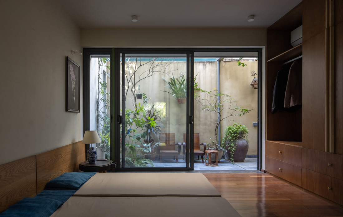 Phòng ngủ hai vợ chồng tại tầng trệt nhìn ra ban công vườn.