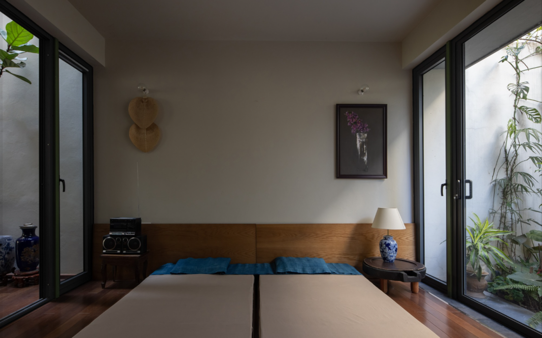 Phòng ngủ của gia chủ được đặt kín đáo phía cuối nhà, ngăn cách với không gian chung bằng những vách ngăn mang tính biểu tượng. Điểm đặc biệt là căn phòng này mở toang ra một sân vườn thứ hai phía sau. Cách thiết kế này đảm bảo sự riêng tư nhưng vẫn tràn ngập khí trời, giúp người cao tuổi luôn cảm thấy thư thái, không bị tách biệt với môi trường bên ngoài.