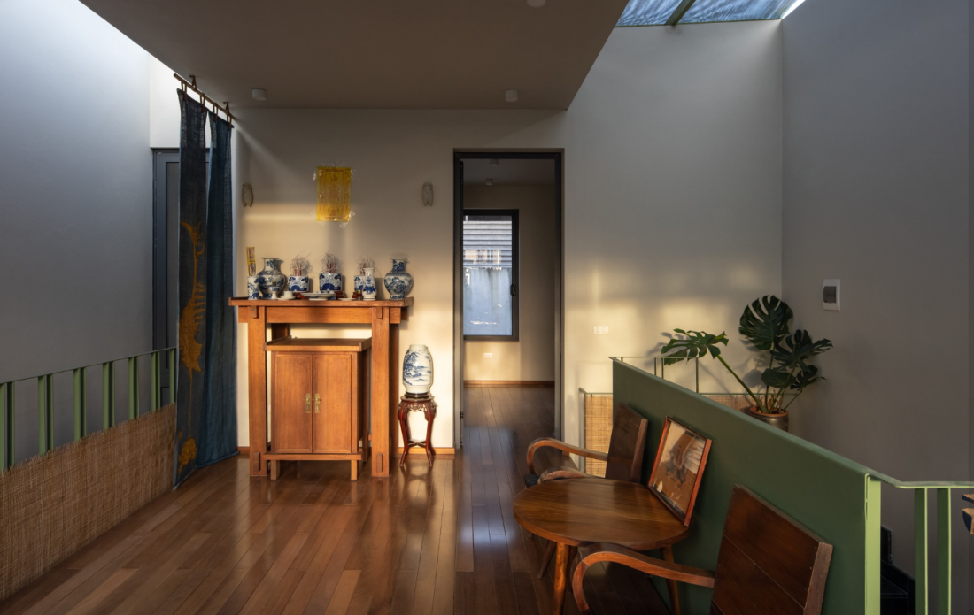 Lên tầng hai, không gian thờ tự được đặt trang trọng ở chính giữa, nơi tĩnh lặng nhất. Phía trước là một sân thượng rộng lớn với khu vườn thứ ba, tạo thành một vòng lặp xanh từ trước ra sau, từ dưới lên trên.