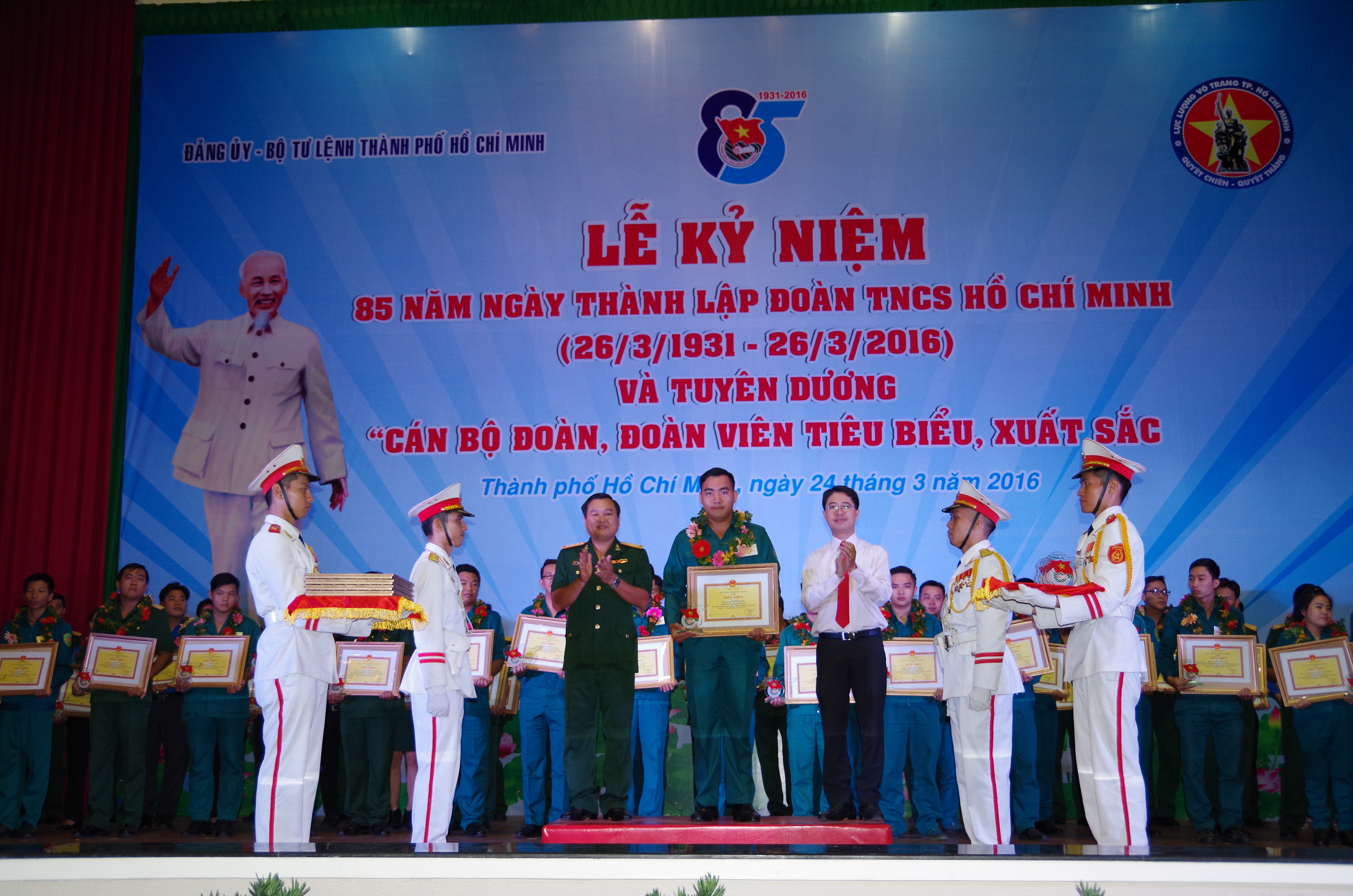 Đại tá Trần Vinh Ngọc, Chủ nhiệm Chính trị Bộ Tư lệnh Thành phố và đồng chí Phạm Hồng Sơn, Phó Bí thư Thành Đoàn TPHCM trao thưởng đoàn viên dân quân tiêu biểu, xuất sắc