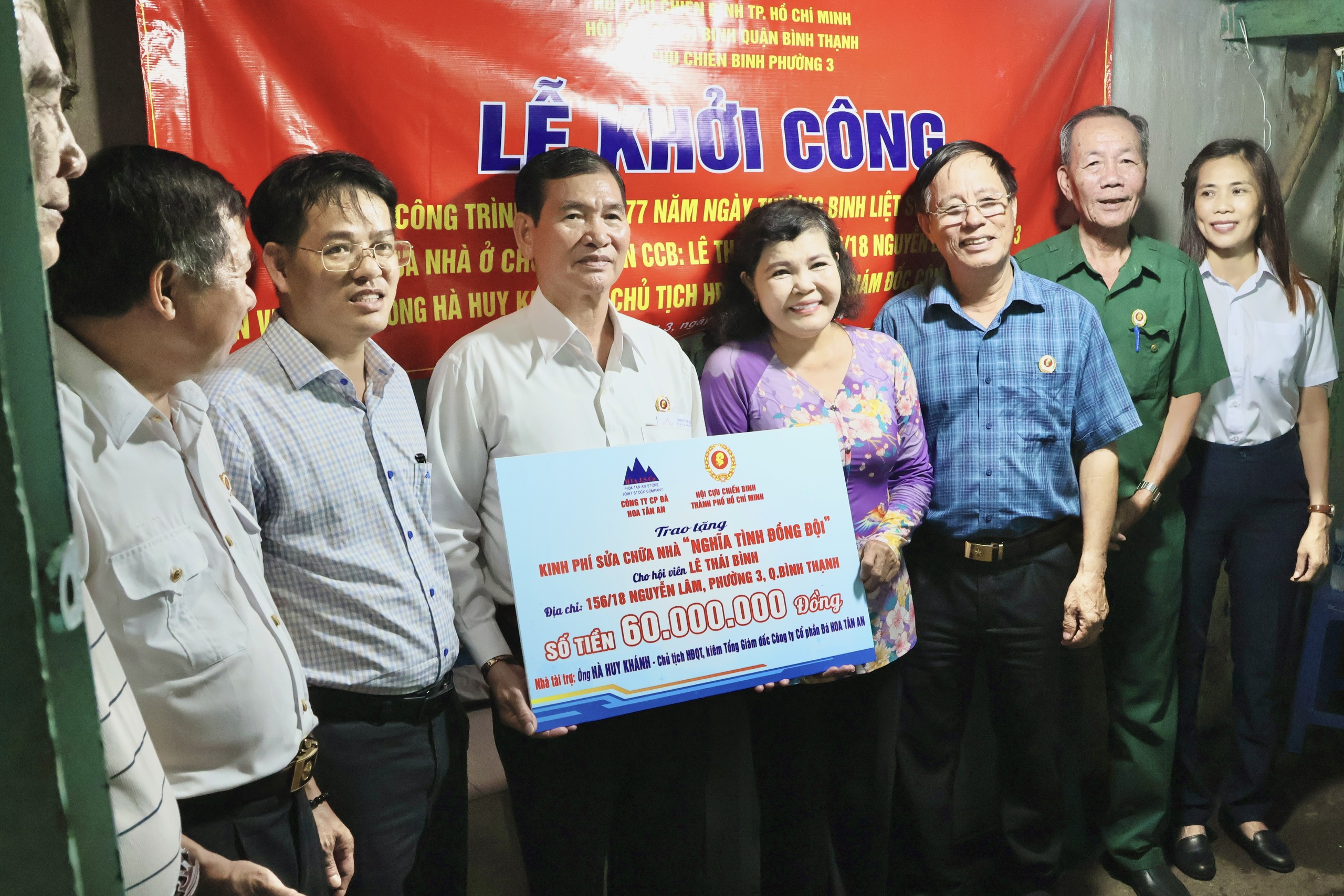 Sau khi nhận được hồ sơ từ Hội CCB phường, nhà tài trợ doanh nhân CCB Hà Huy Khánh, Giám đốc Quỹ Hỗ trợ cựu chiến binh nghèo TP.HCM, Chủ tịch HĐQT - Tổng giám đốc Công ty cổ phần đá hoa Tân An đã trao tặng tổng kinh phí 60 triệu đồng cho bà Nguyễn Hồng Vân. Dự kiến, căn nhà sẽ được xây mới với kết cấu một trệt một gác, mái tole, tường gạch, có cả nhà vệ sinh.
