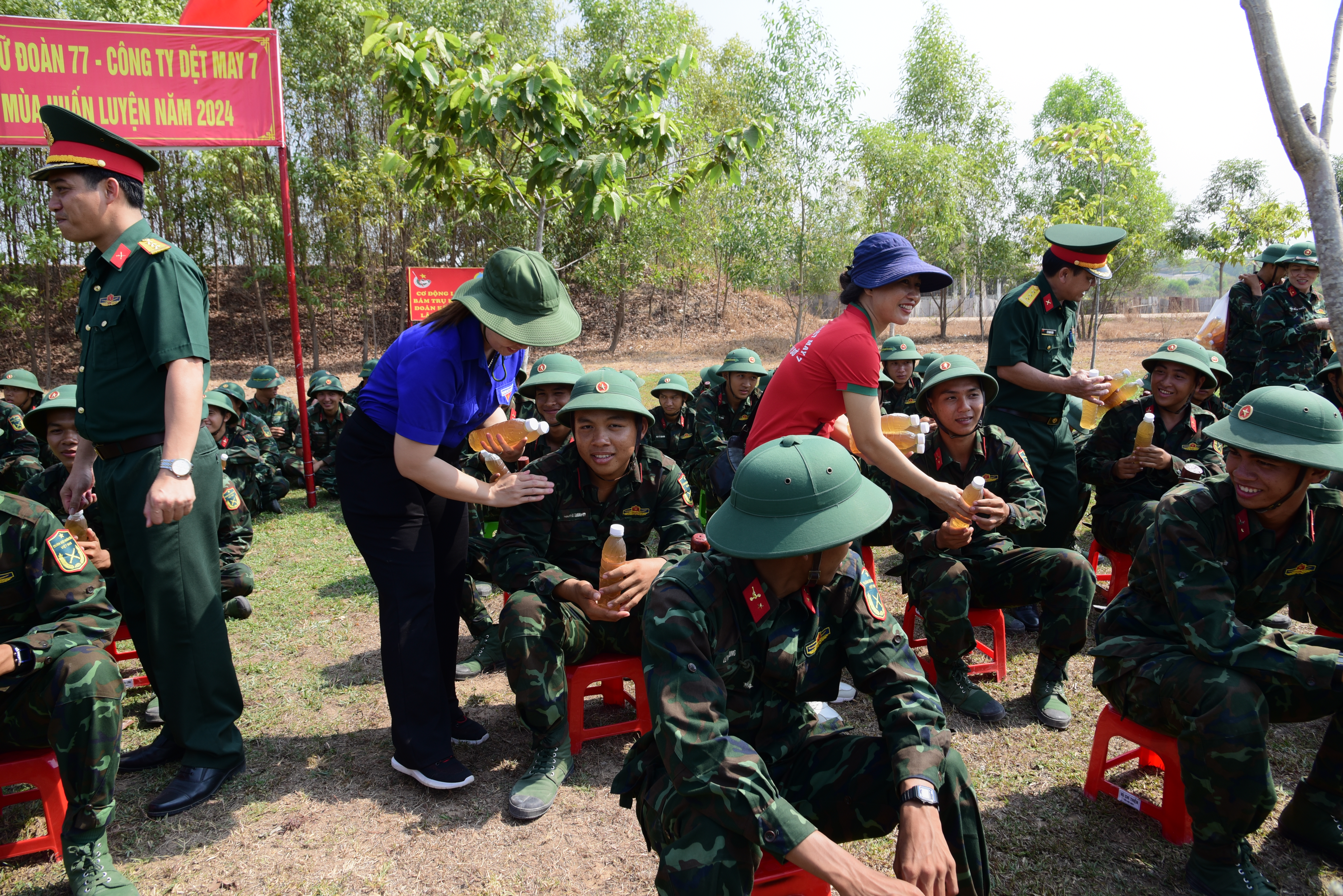 Đồng hành cùng chiến sĩ mới, Hội phụ nữ Lữ đoàn 77 cùng với Hội phụ nữ, Đoàn thanh niên Công ty Dệt may 7 đến tận thao trường để chia sẻ niềm vui cũng như tiếp thêm niềm tin cho chiến sĩ mới. Những tiết mục văn nghệ đơn giản nhưng làm cho không khí thao trường thêm rộn rã, xua tan cái oi nồng của nắng miền Đông, tiếp thêm tinh thần cho chiến sĩ bước vào kiểm tra.