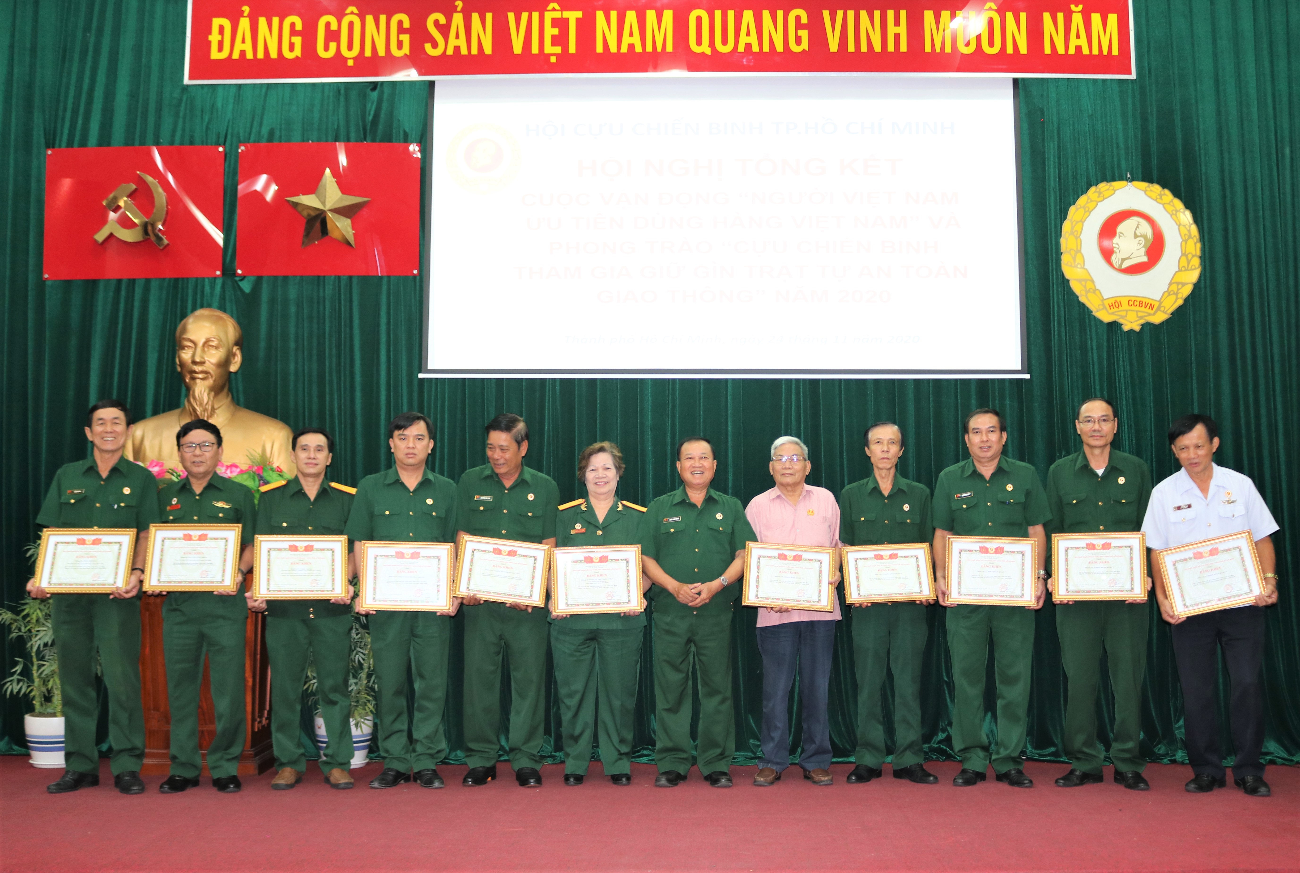 Tại hội nghị, đại diện Hội CCB TP.HCM tặng bằng khen cho 23 tập thể, 3 cá nhân có thành tích trong thực hiện Cuộc vận động “Người Việt Nam ưu tiên dùng hàng Việt Nam” và 21 tập thể, 4 cá nhân trong Phong trào “Cựu chiến binh tham gia giữ gìn trật tự an toàn giao thông” năm 2020.