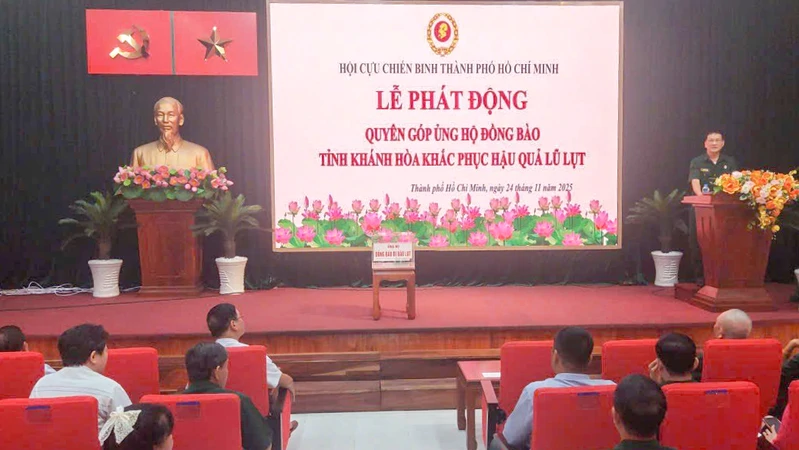(QK7 Online) - Chiều ngày 24/11 tại Hội trường Thành Hội, hưởng ứng lời kêu gọi của UBMTTQ Việt Nam Thành phố Hồ Chí Minh, Thường trực Hội Cựu chiến binh (CCB) Thành phố tổ chức Lễ phát động quyên góp ủng hộ đồng bào tỉnh Khành Hòa khắc phục hậu quả lũ lụt.