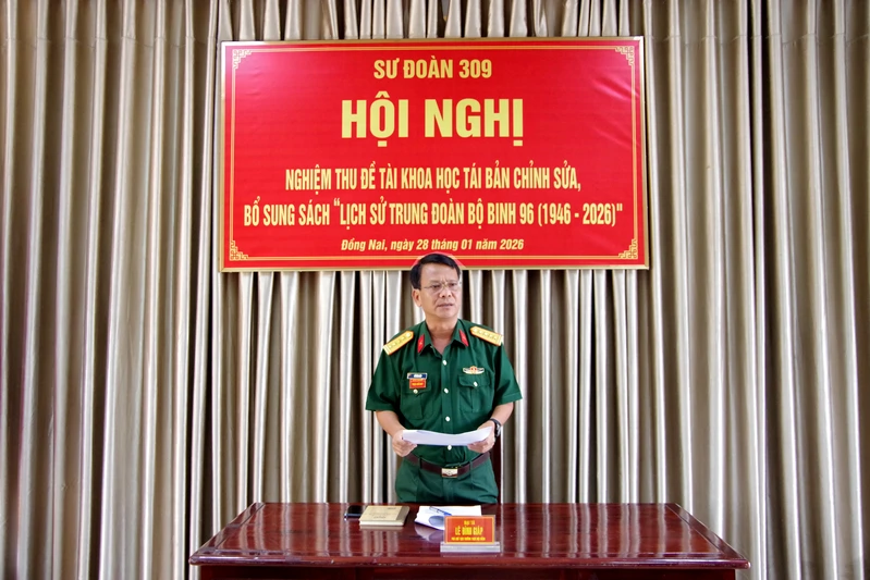 (QK7 Online) - Chiều ngày 28/1, Hội đồng Khoa học Sư đoàn 309 tổ chức Hội nghị nghiệm thu đề tài khoa học tái bản, chỉnh sửa, bổ sung sách “Lịch sử Trung đoàn Bộ binh 96 (1946–2026)”. Đại tá Lê Đình Giáp, Phó Sư đoàn trưởng Sư đoàn 309 chủ trì hội nghị.