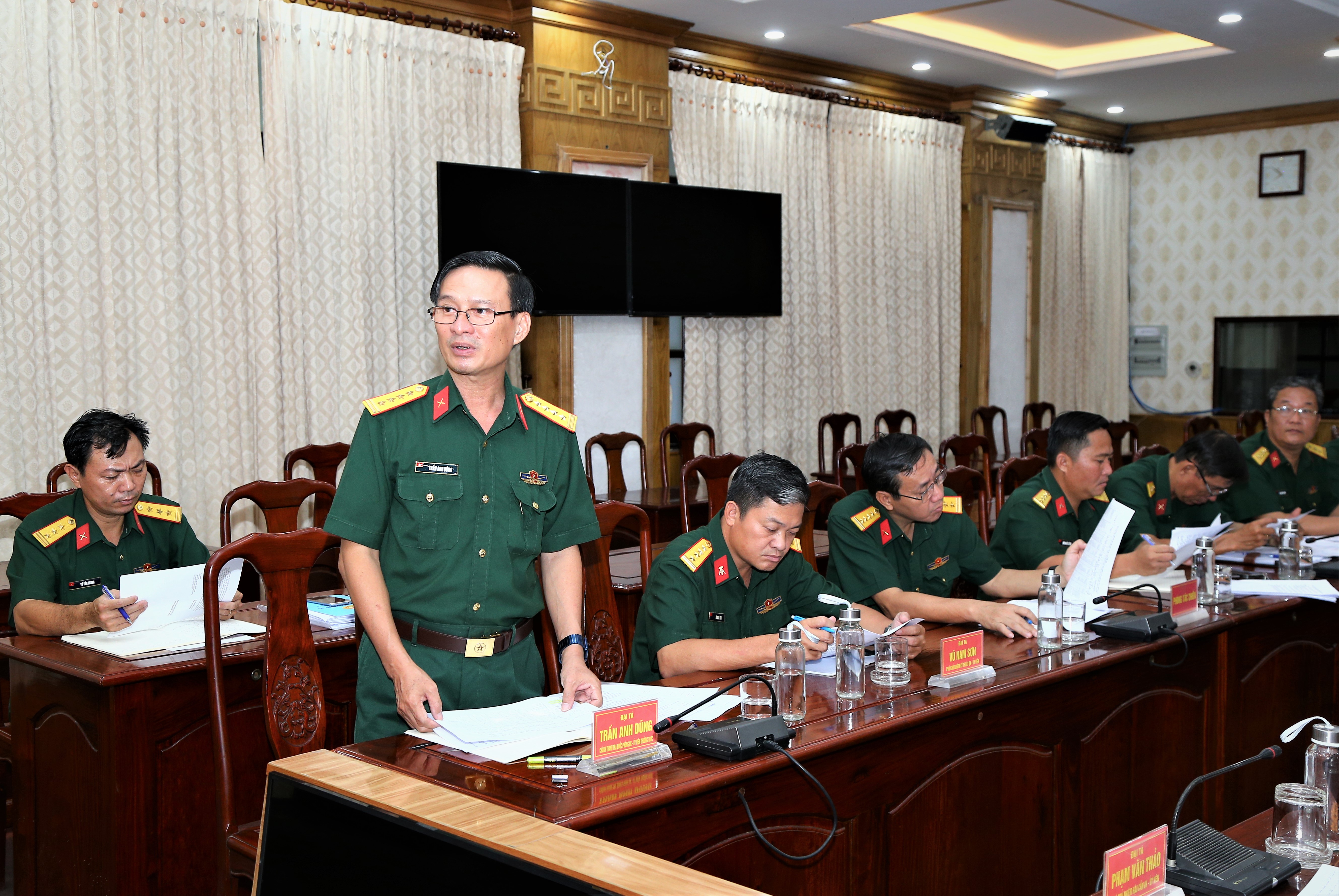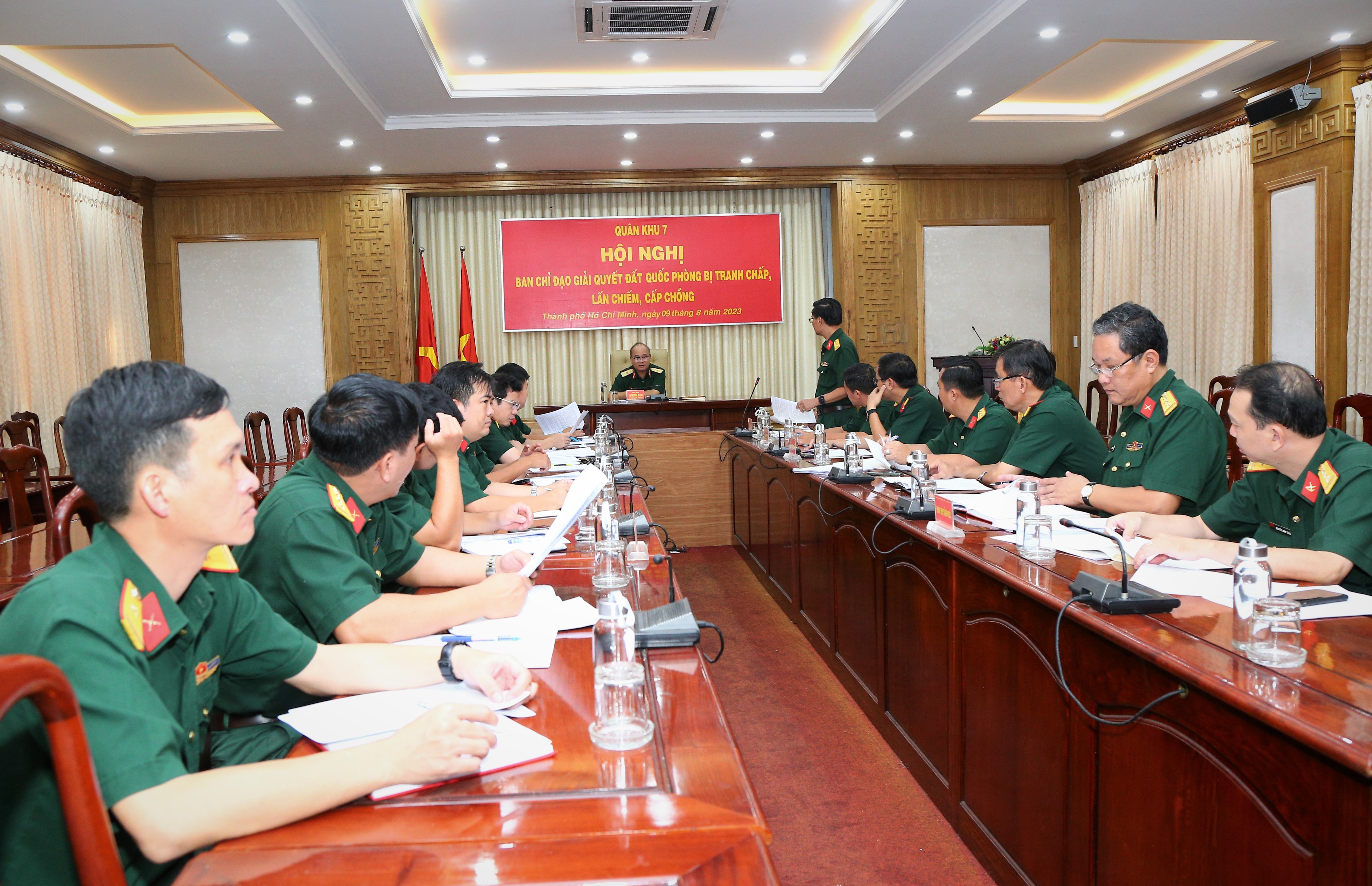Đại tá Trần Anh Dũng, Chánh Thanh tra quốc phòng Quân khu, Ủy viên Thường trực Ban chỉ đạo giải quyết đất quốc phòng Quân khu trình bày dự thảo báo cáo kết quả giải quyết đất quốc phòng bị tranh chấp, lấn chiếm, cấp chồng năm 2022 và 7 tháng đầu năm 2023.