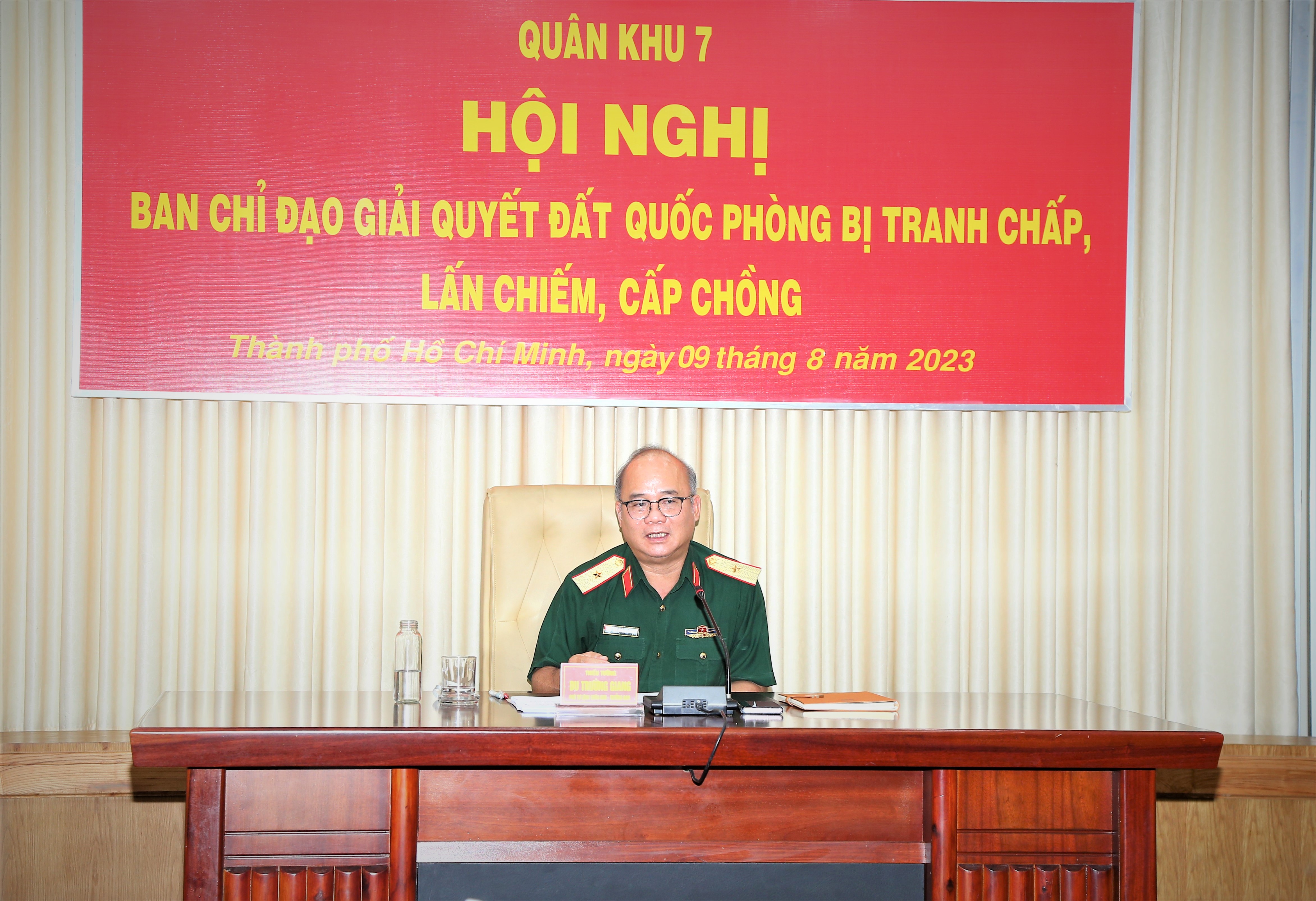 (QK7 Online) - Ngày 9-8, Quân khu tổ chức hội nghị Ban chỉ đạo giải quyết đất quốc phòng bị tranh chấp, lấn chiếm, cấp chồng. Thiếu tướng Du Trường Giang, Phó Tư lệnh Quân khu, Trưởng Ban chỉ đạo giải quyết đất quốc phòng Quân khu chủ trì hội nghị.