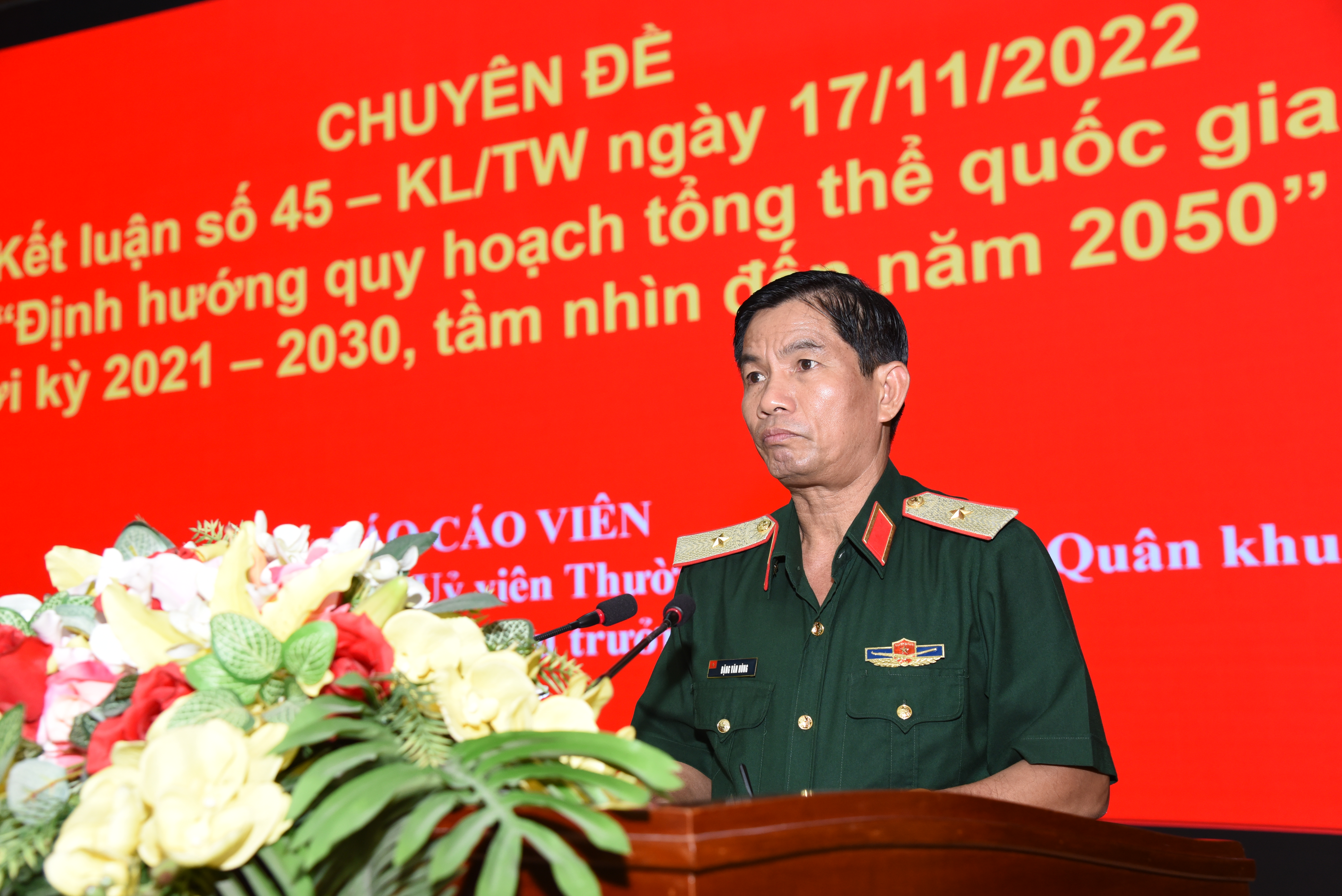 Thiếu tướng Đặng Văn Hùng, Ủy viên Thường vụ Đảng ủy Quân khu, Phó Tư lệnh Tham mưu trưởng Quân khu giới thiệu chuyên đề:“Định hướng Quy hoạch tổng thể quốc gia thời kỳ 2021 - 2030, tầm nhìn đến năm 2050”