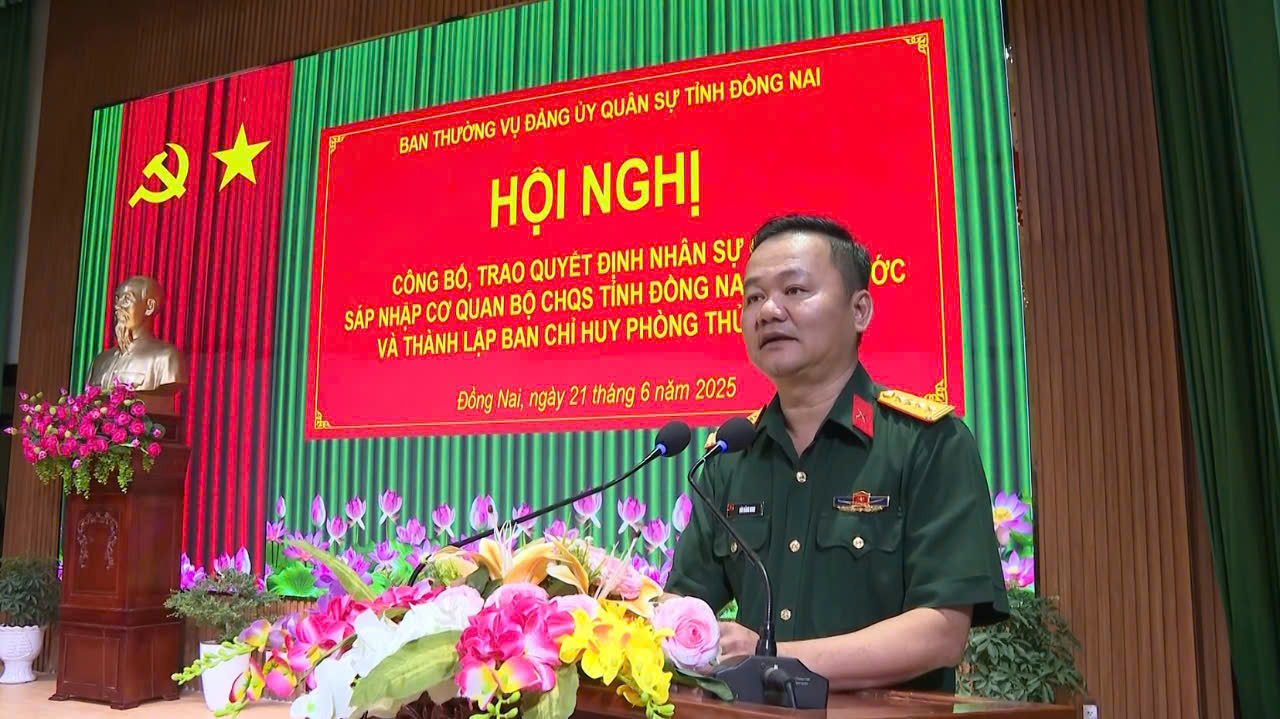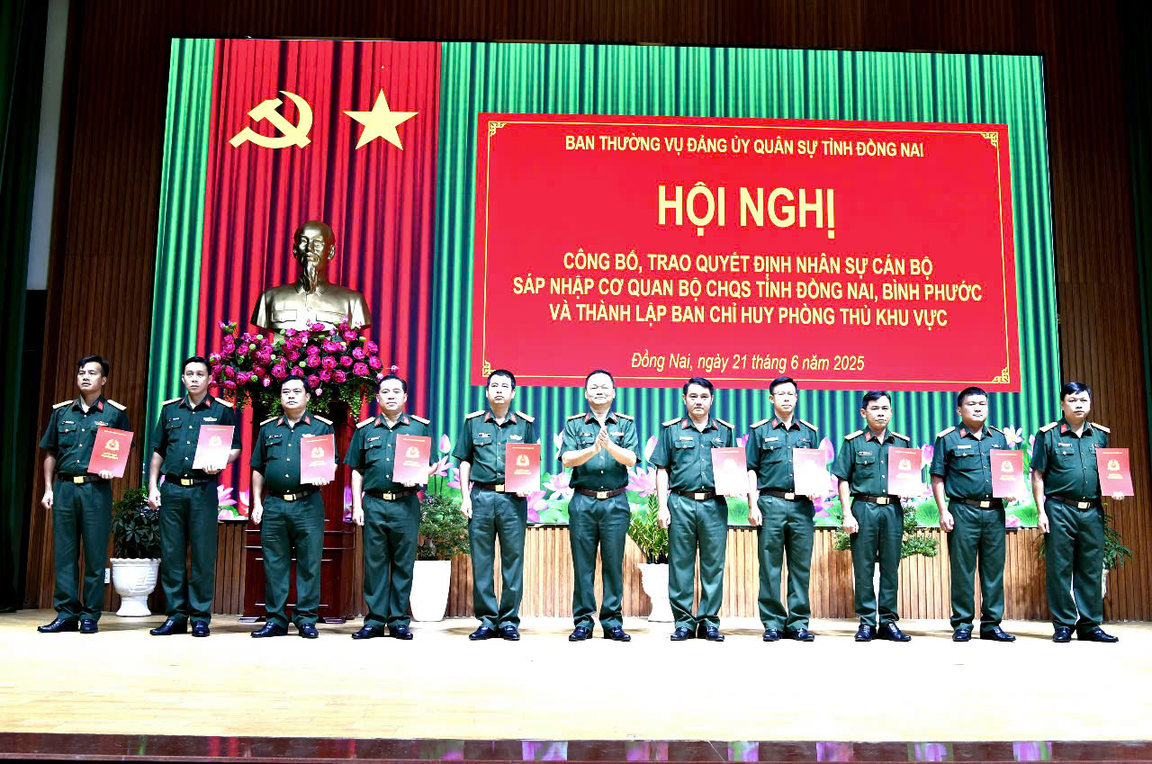 (QK7 Online) - Sáng ngày 21/6, Thường vụ Đảng ủy, Bộ CHQS tỉnh Đồng Nai tổ chức hội nghị công bố, trao quyết định nhân sự cán bộ sáp nhập cơ quan Bộ CHQS tỉnh Đồng Nai, Bình Phước và thành lập 2 Ban Chỉ huy phòng thủ khu vực.