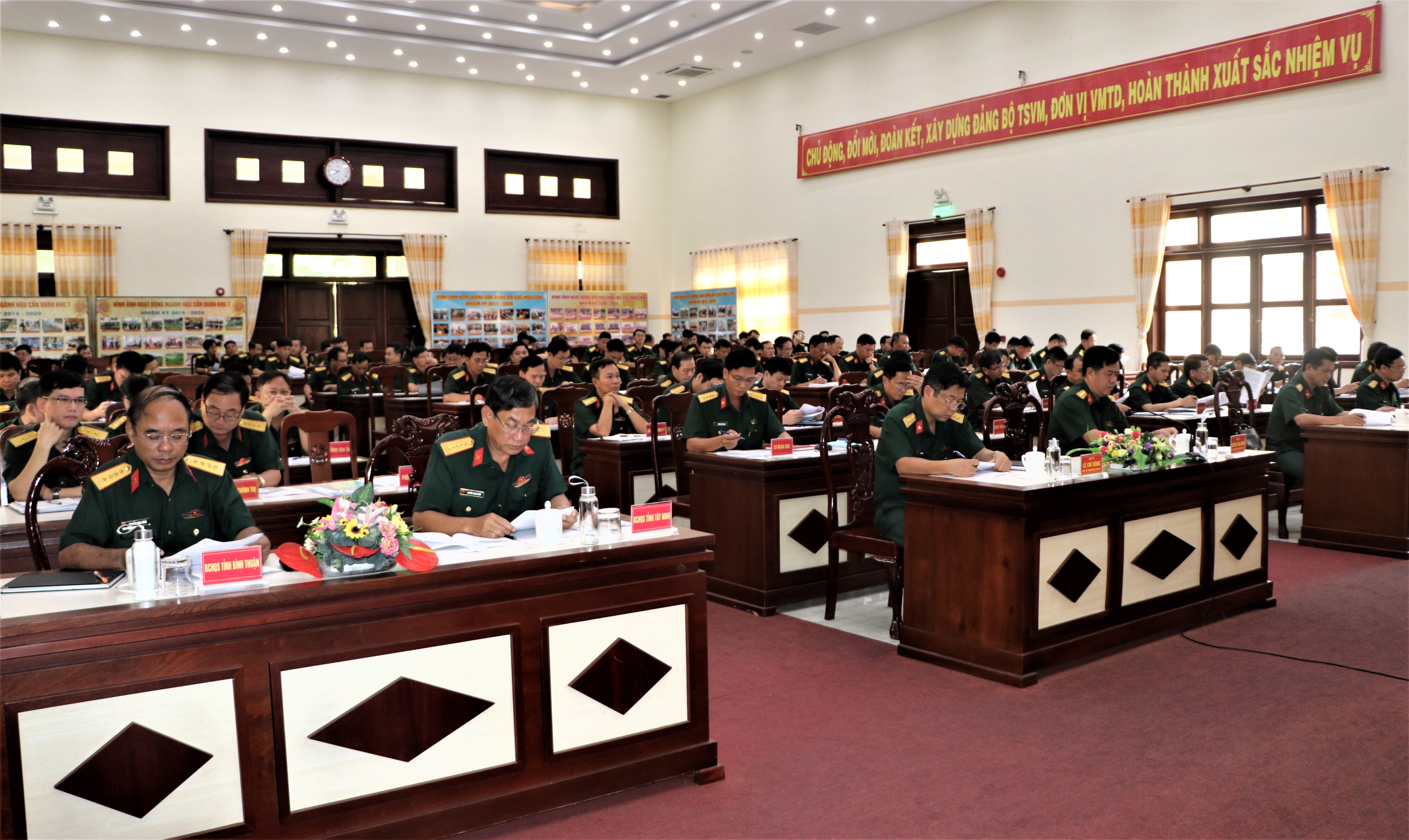 Đại tá Huỳnh Tấn Hùng, Chủ nhiệm Hậu cần Quân khu duy trì thảo luận tại hội nghị.