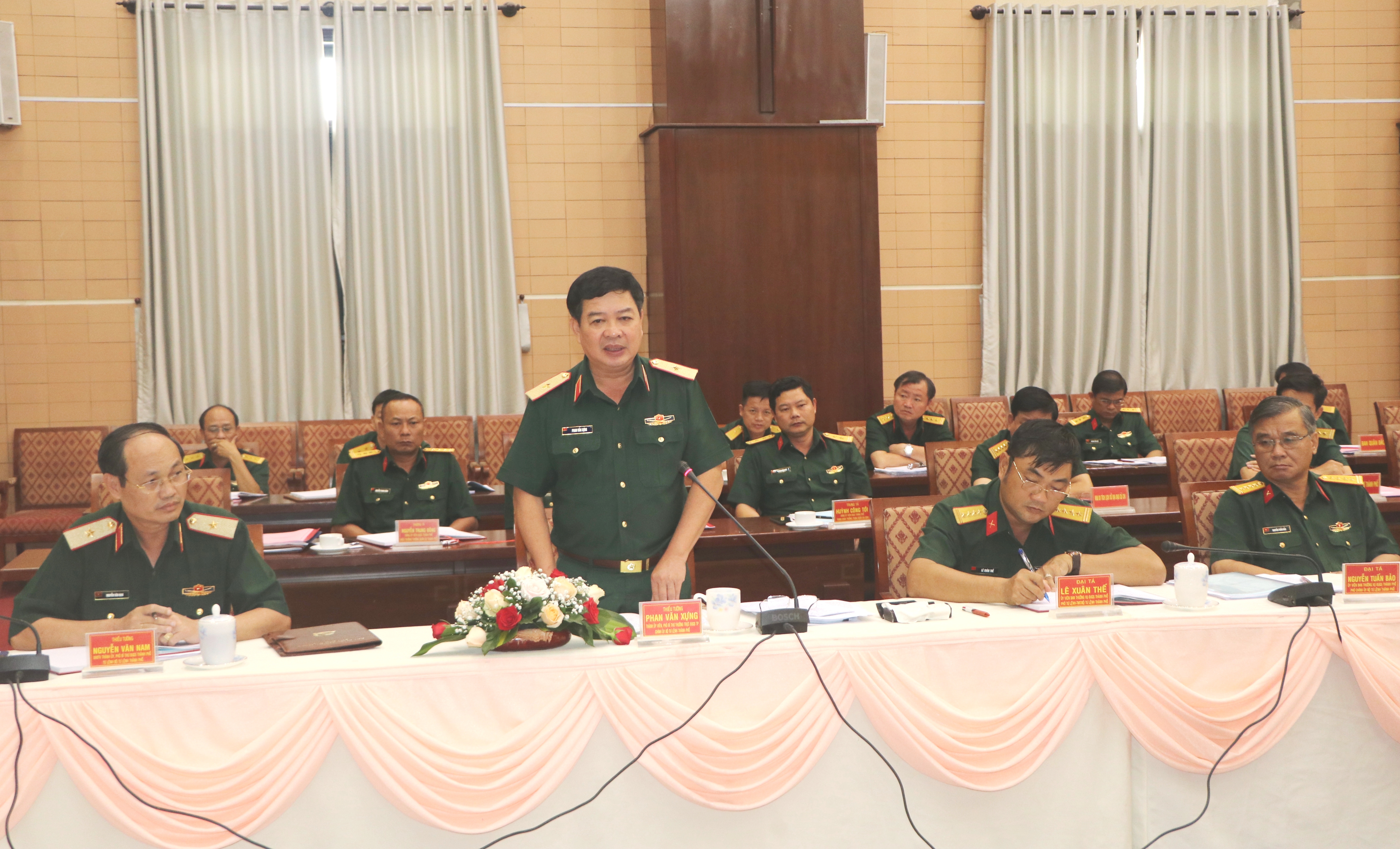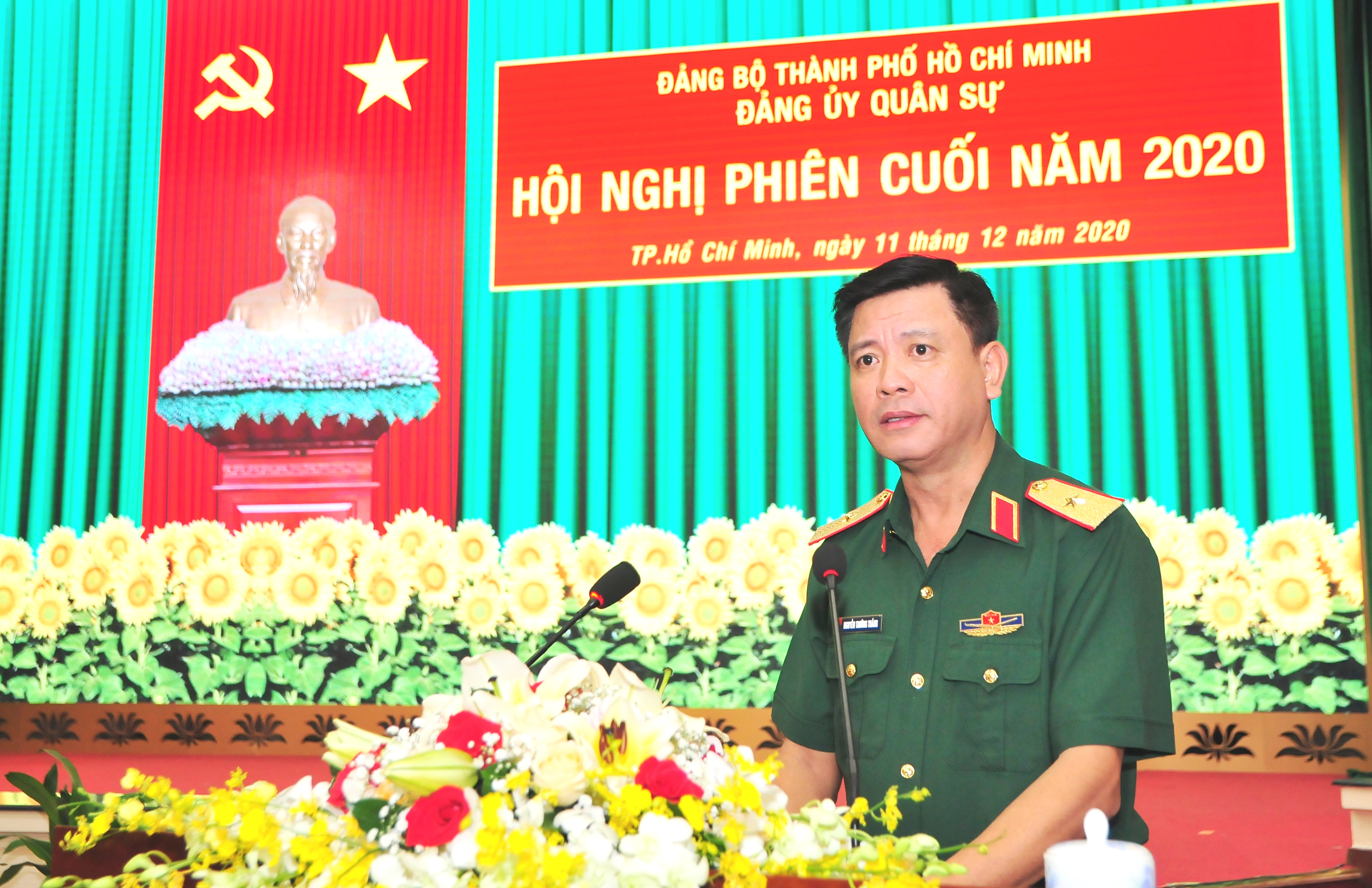 Thiếu tướng Phan Văn Xựng, Phó Bí thư thường trực Đảng ủy Quân sự thành phố, Chính ủy Bộ Tư lệnh Thành phố Hồ Chí Minh phát biểu tại hội nghị.