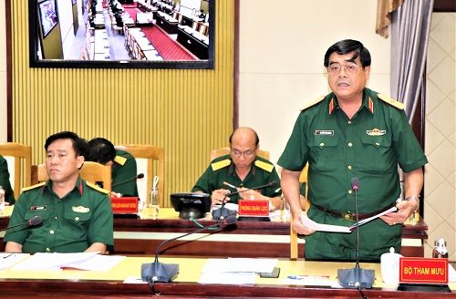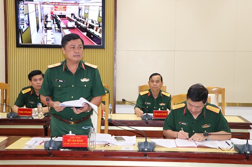 Thiếu tướng Đỗ Văn Bảnh, Chủ nhiệm Chính trị Quân khu phát biểu góp ý tại hội nghị.