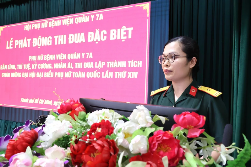 Thiếu tá Trần Thị Hoa Hồng, Chủ tịch Hội Phụ nữ Bệnh viện Quân y 7A phát động đợt thi đua đặc biệt năm 2026.