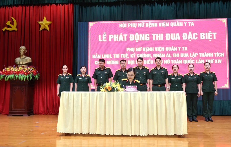 Đại điện các Chi hội Phụ nữ ký kết giao ước thi đua đặc biệt với chủ đề “Phụ nữ Bệnh viện Quân y 7A bản lĩnh, trí tuệ, kỷ cương, nhân ái, thi đua lập thành tích chào mừng Đại hội đại biểu Phụ nữ toàn quốc lần thứ XIV”.
