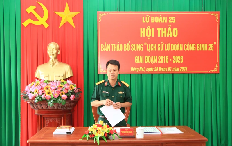 (QK7 Online) - Chiều ngày 26/1, Lữ đoàn 25 tổ chức Hội thảo bản thảo bổ sung “Lịch sử Lữ đoàn Công binh 25” giai đoạn 2016 - 2026. Dự và chỉ đạo Hội thảo có Đại tá Nguyễn Hồng Cảnh, Phó Chủ nhiệm Chính trị Quân khu 7; các đại biểu lãnh đạo, chỉ huy Lữ đoàn qua các thời kỳ.