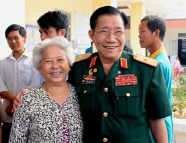 Thiếu tướng Trần Ngọc Thổ thăm hỏi người dân xã Tân Ninh, huyện Tân Thanh, tỉnh Long An trong một chuyến công tác. Ảnh: CTV